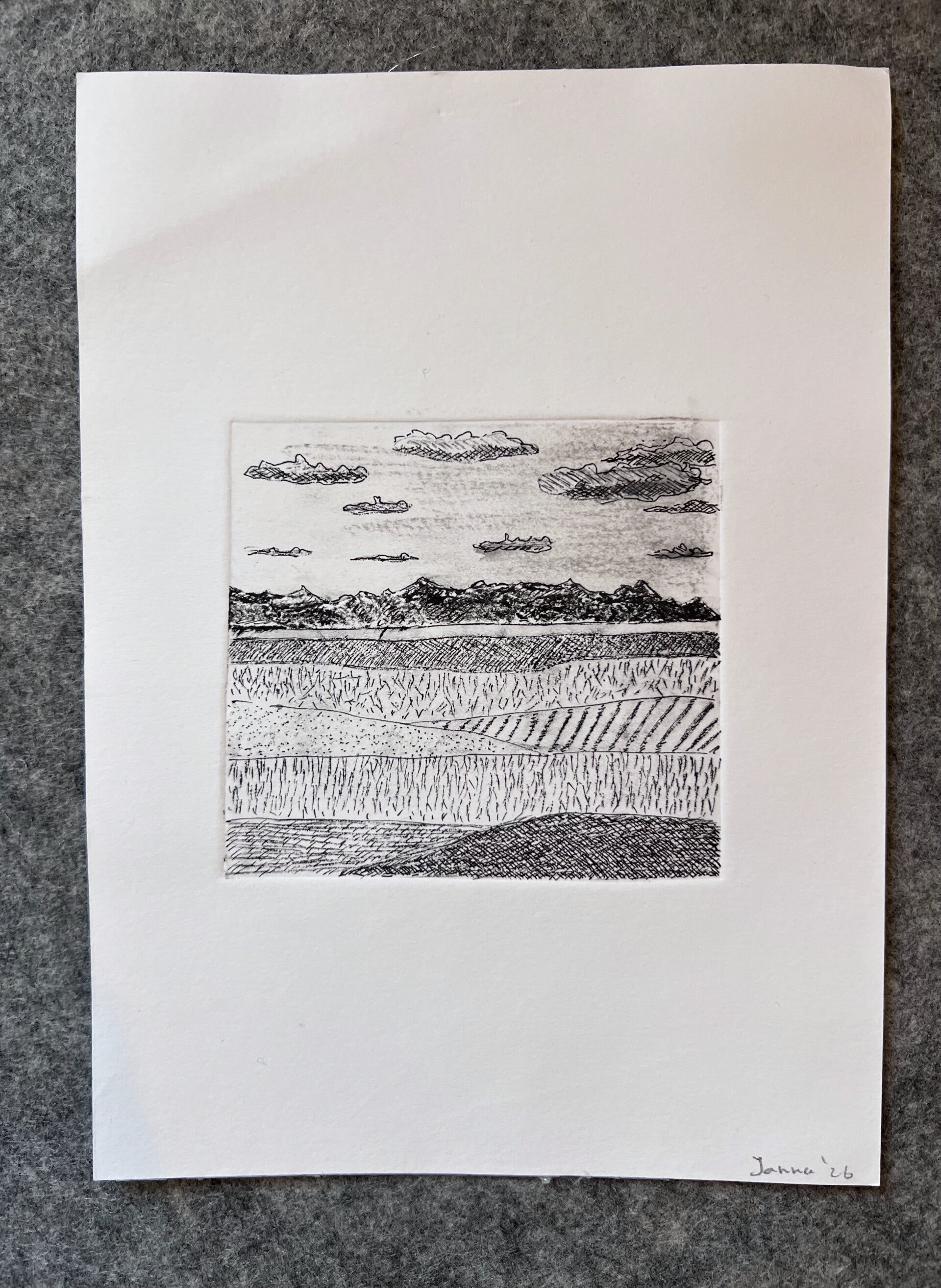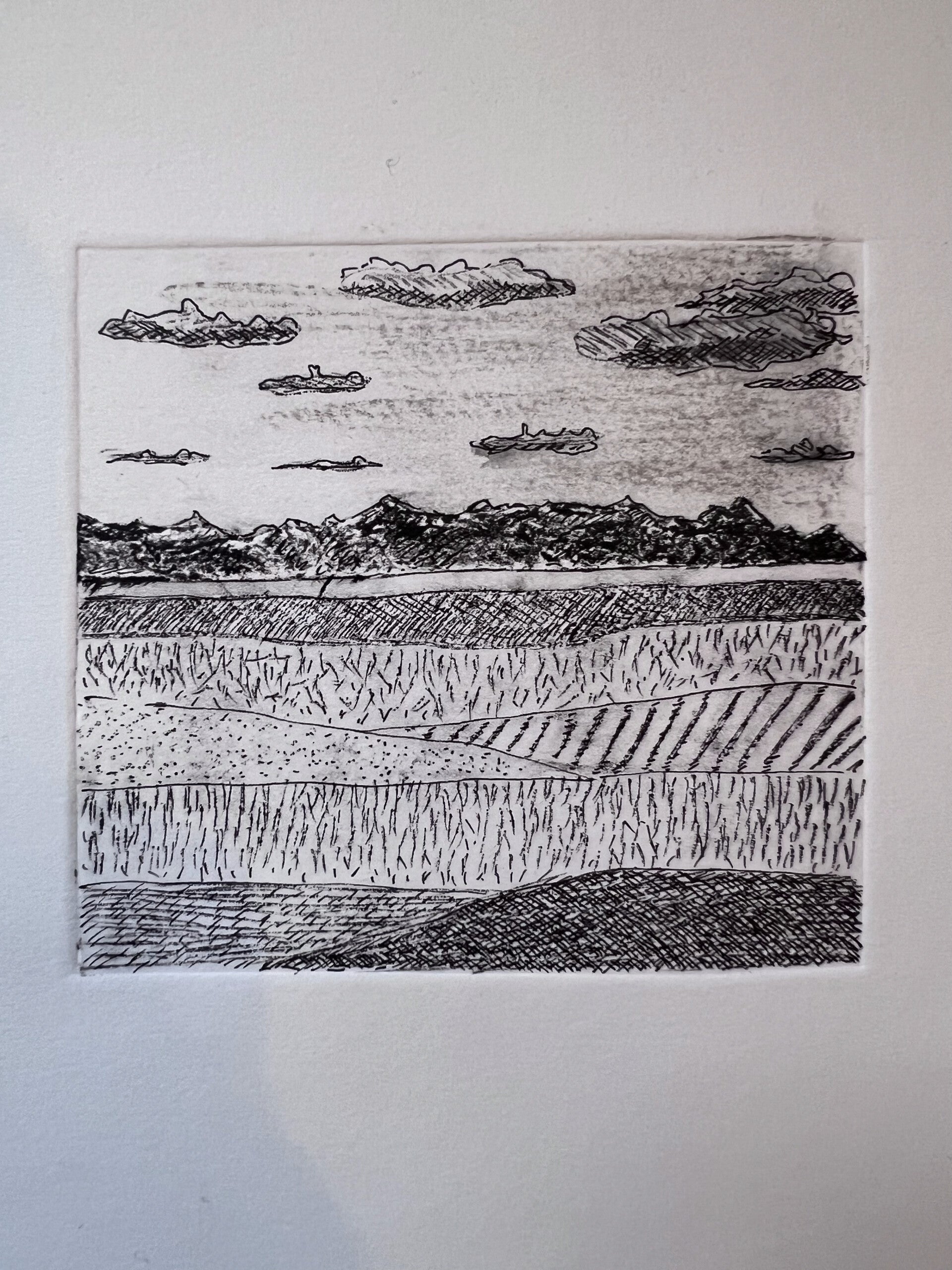 Droge naald ets, details aangebracht met pen.