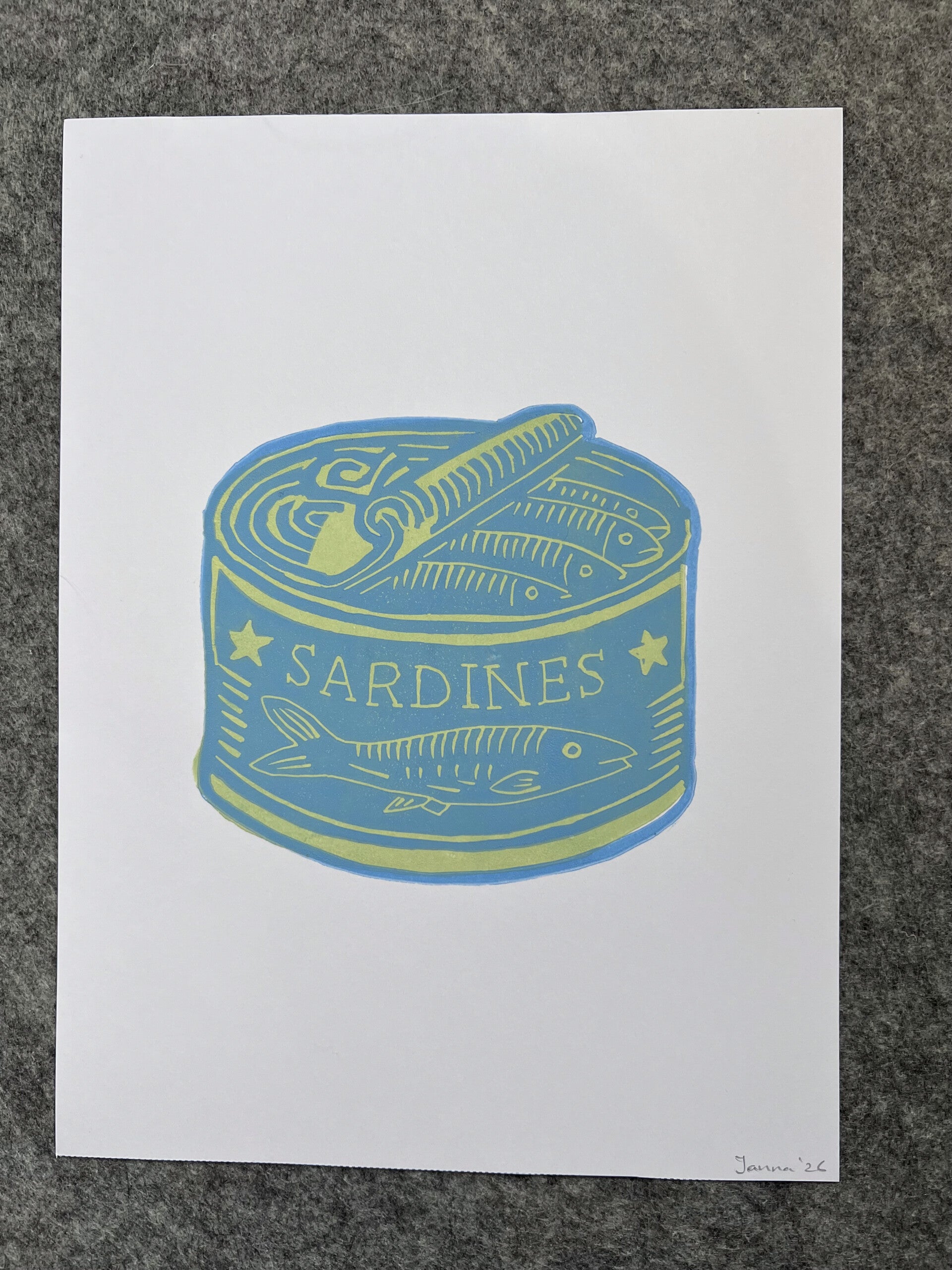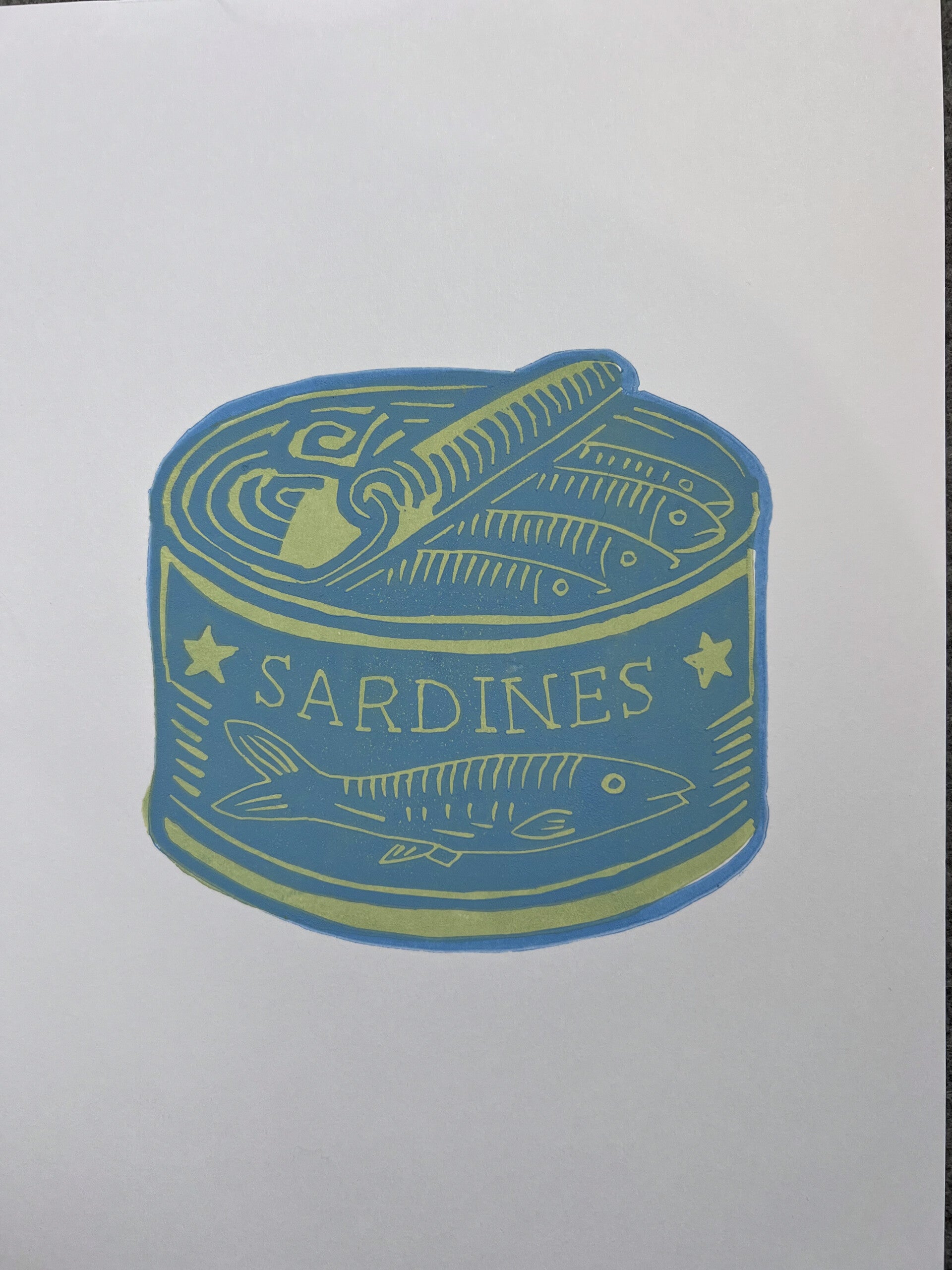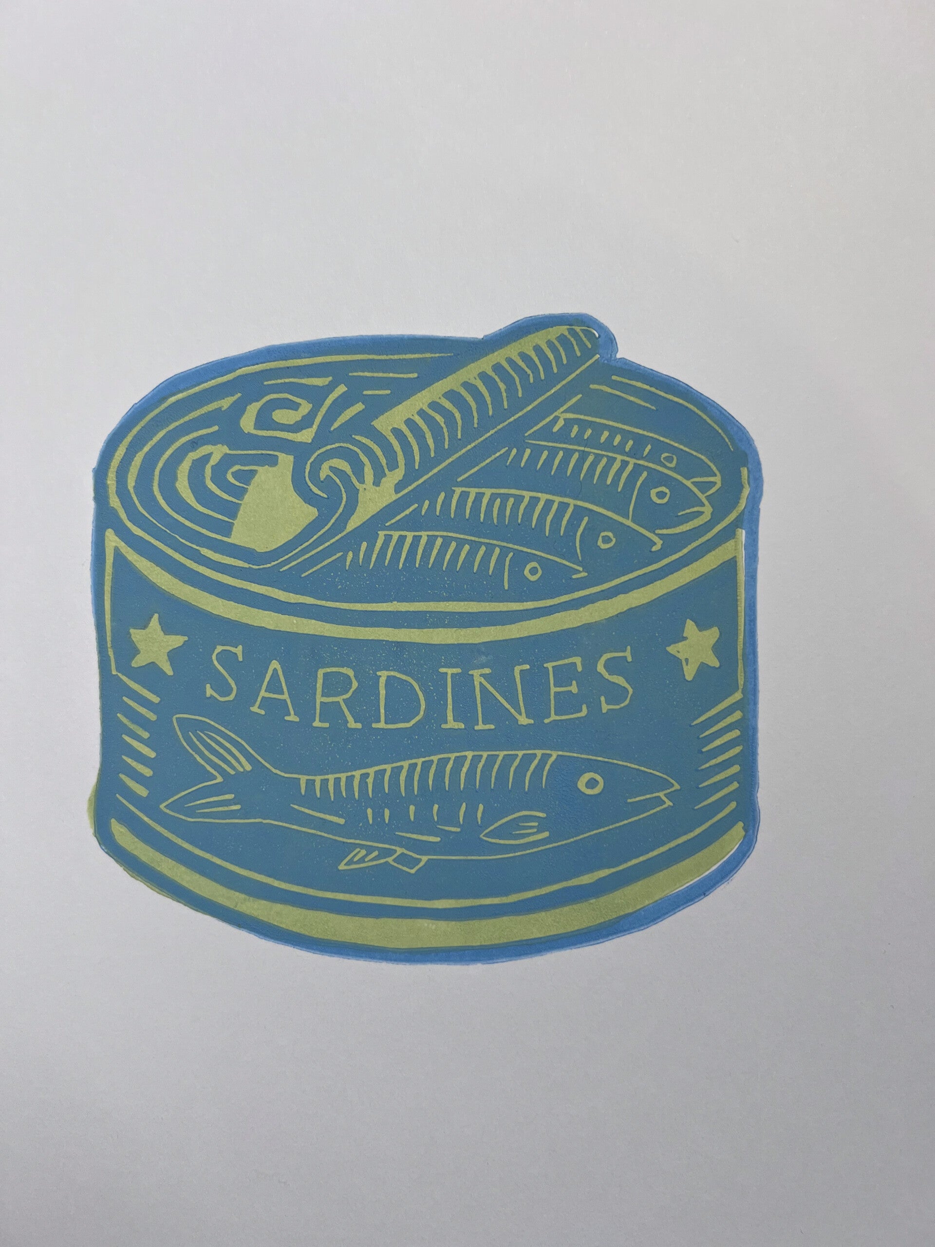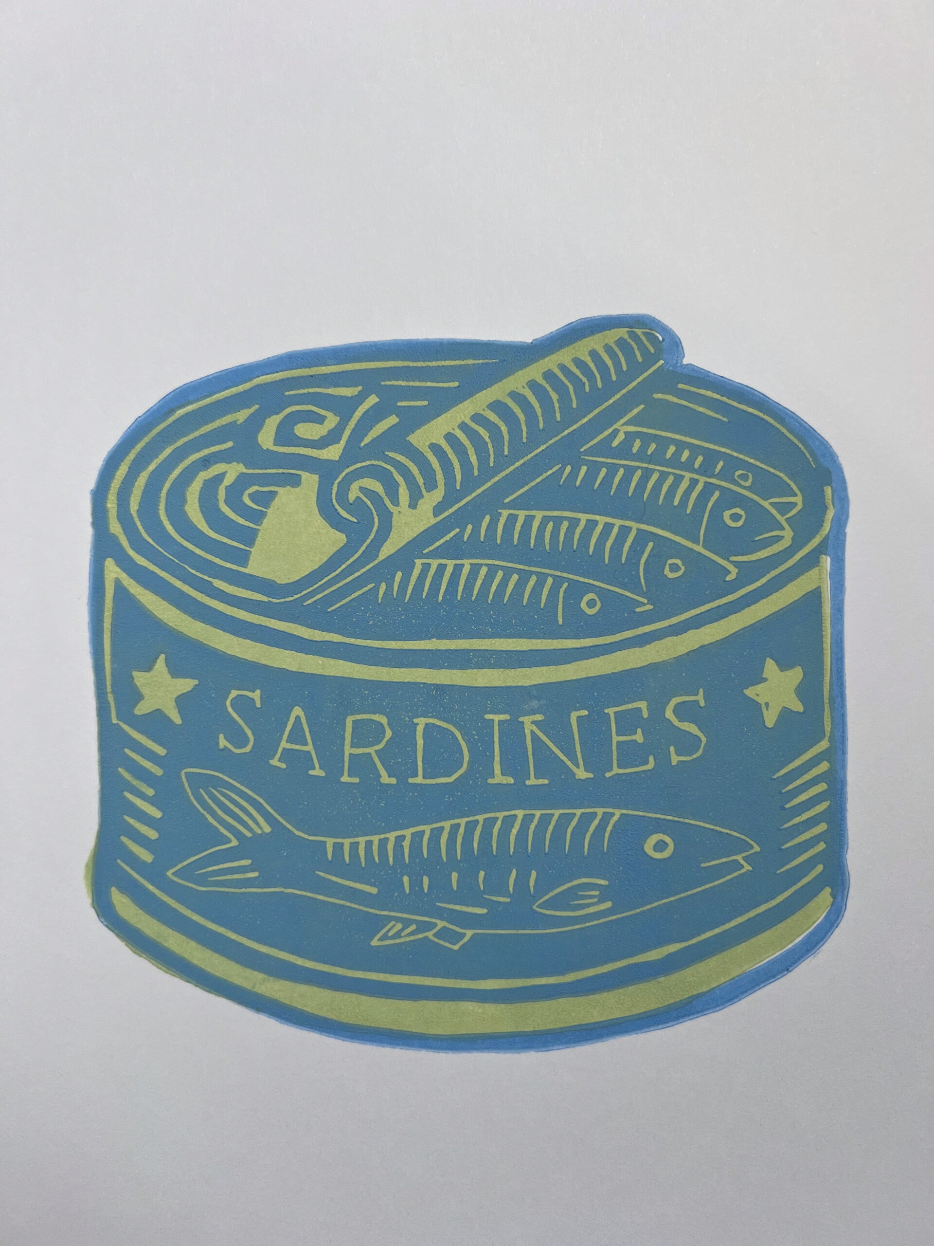 Met de handgesneden en hand afgedrukte linosnede Rond blik sardines. Deze afdruk is gemaakt met behulp van de "multiblock-methode" Deze techniek omvat het snijden van meerdere linoblokken om kleurlagen op te bouwen. Hier zijn twee blokken gebruikt. Let op komt zonder lijst en/of passe partout. Alle linosnedes zijn door mij met de hand gemaakt en met de hand geprint. Handgedrukte linosnedes kunnen van print tot print variëren. Bekijk de foto's goed voor de details. De linosnedes zijn afgdrukt met block printing inkt op waterbasis. Alle lino's worden of zijn met de hand gesigneerd met potlood. Prijzen kunnen variëren vanwege het papier dat gebruikt is en de kwaliteit of complexiteit van de druk van de linosnede.