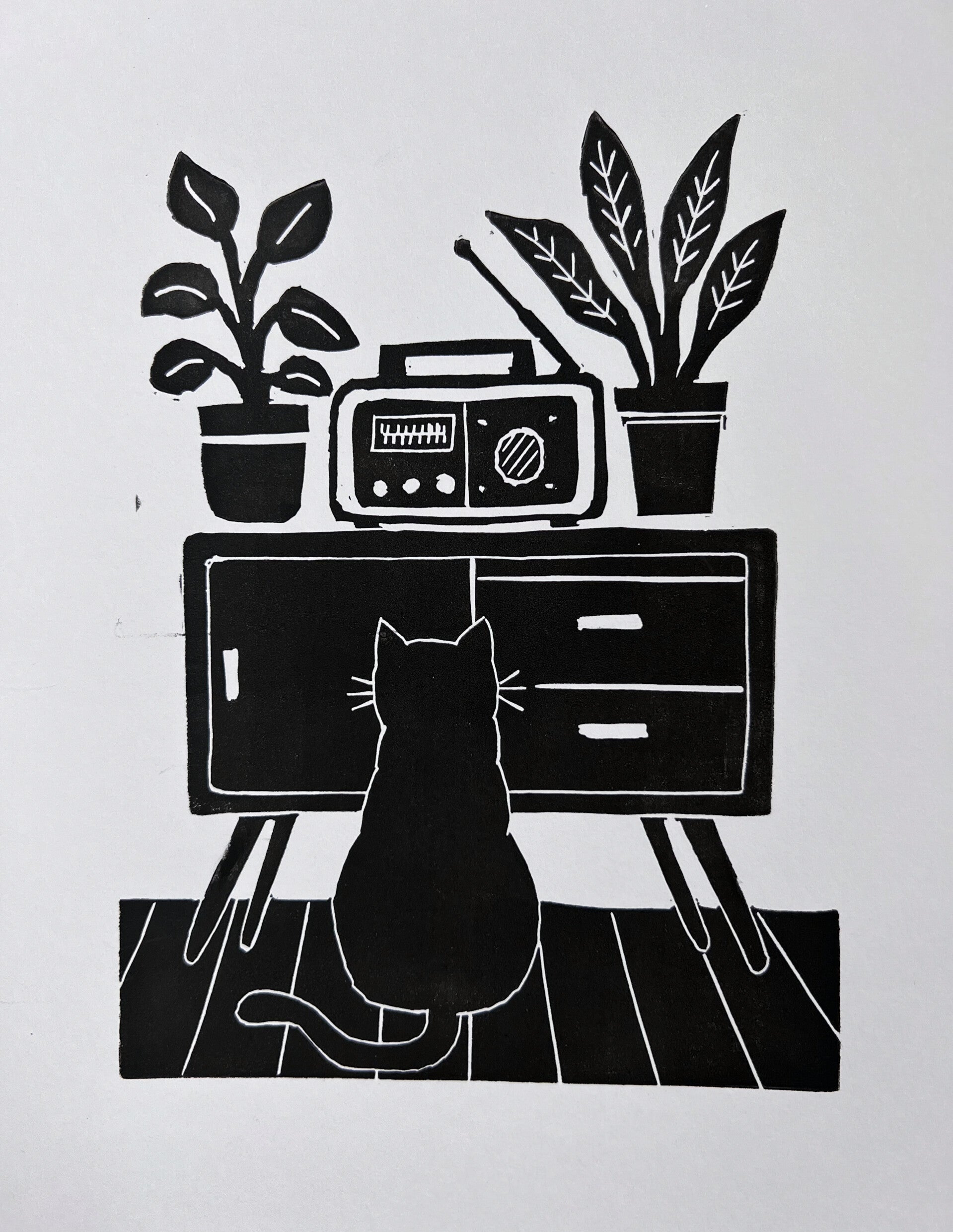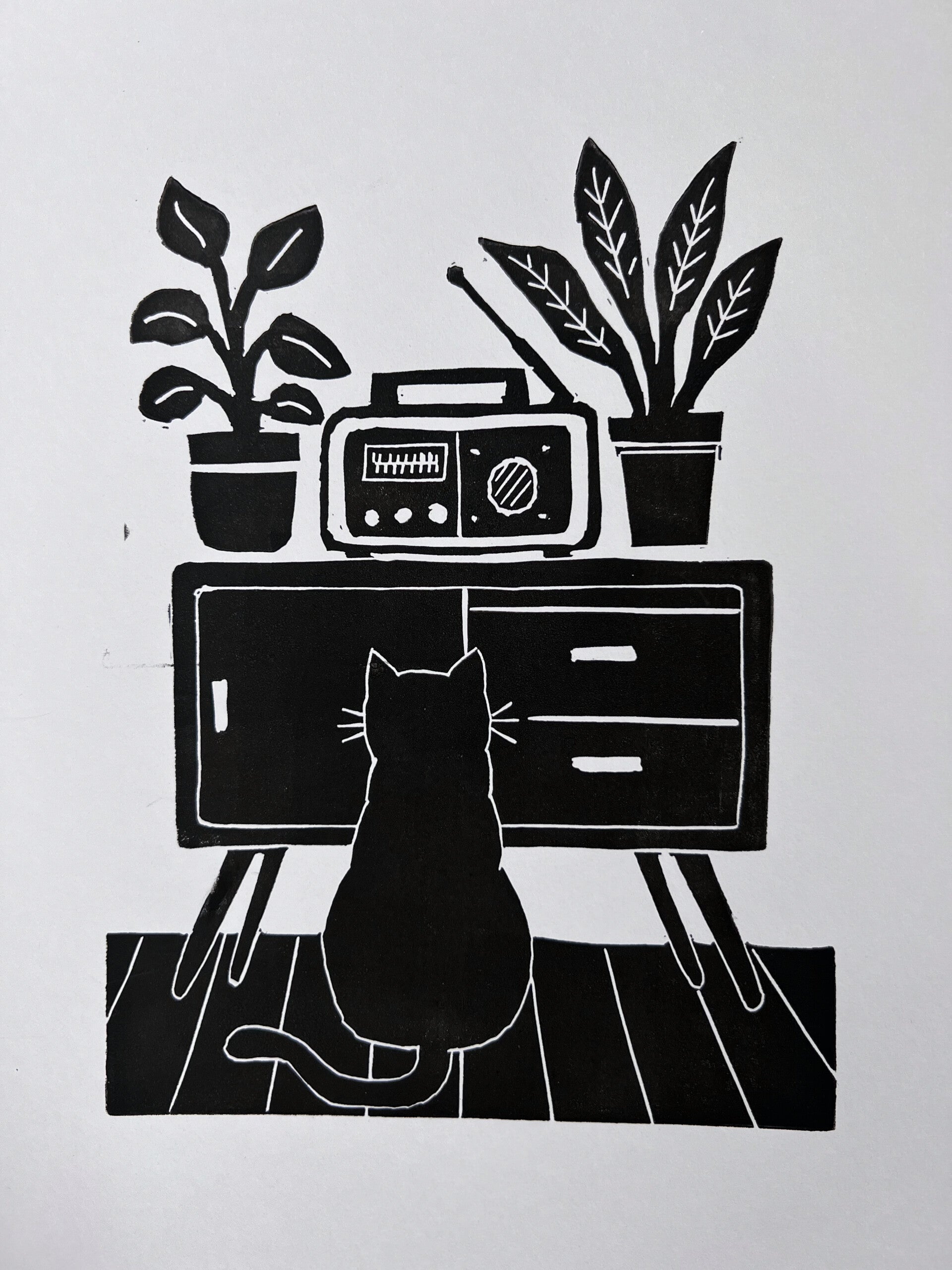 linoprint kat luistert radio