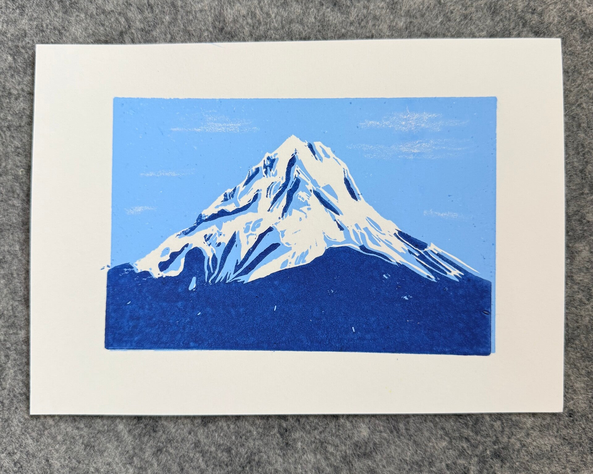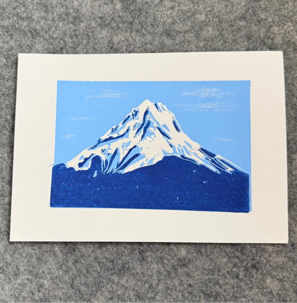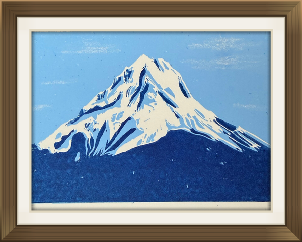 linoprint berg. Het is een reductie linoprint waarbij de kleuren tot stand komen door steeds een laag van het linoleum te verwijderen. Dit is een tweekleurige print.
