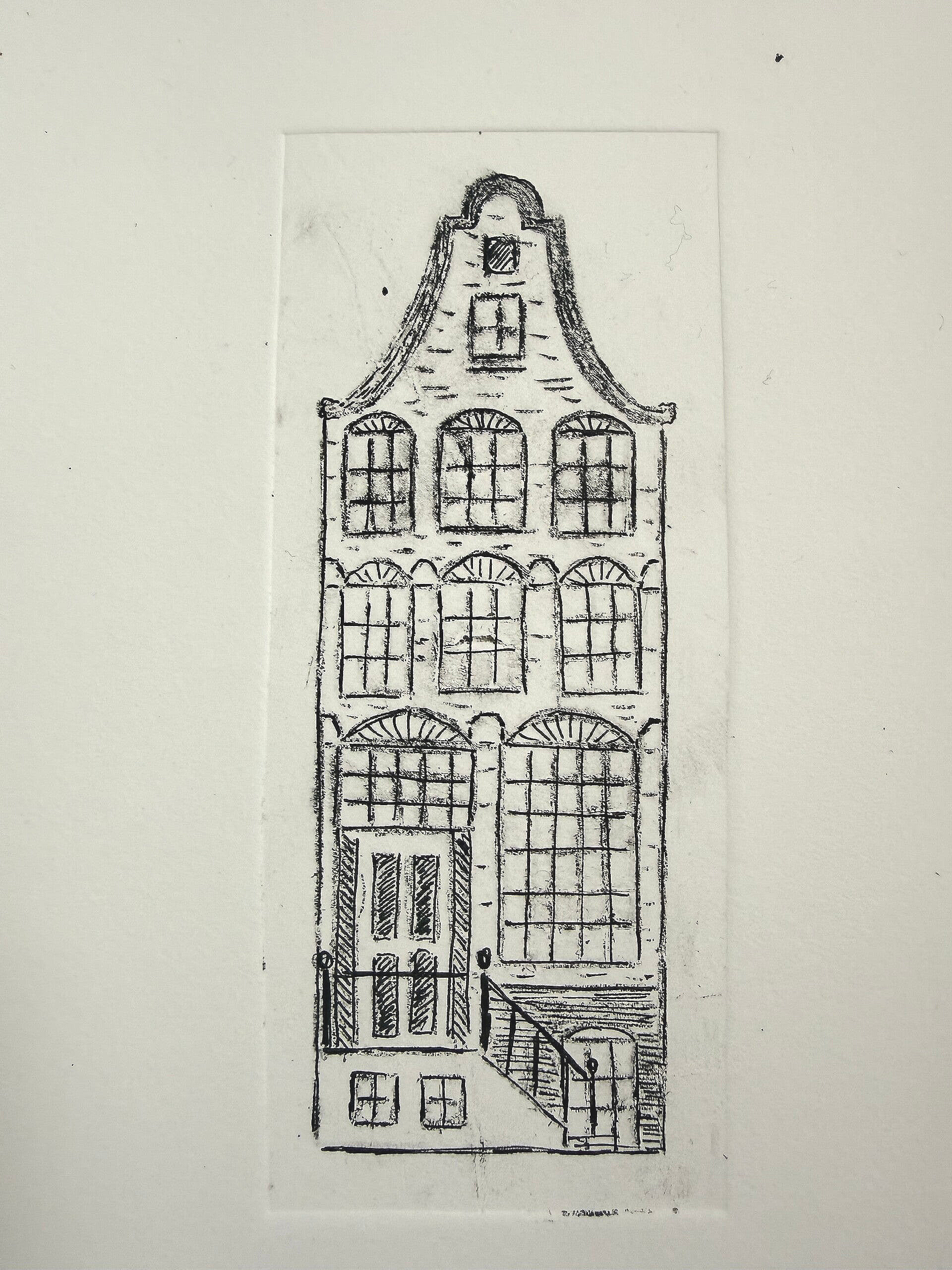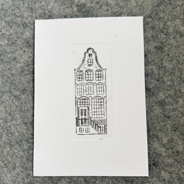 Droge naald techniek ets. Eerst heb ik de ets afgedrukt, waarna ik met pen details heb aangebracht. Afgedrukt met inkt op waterbasis op zuurvrij aquarel papier, 220 g/m2.