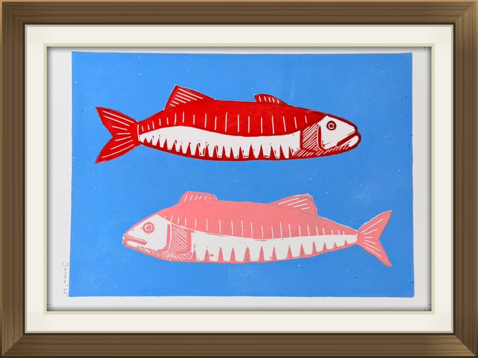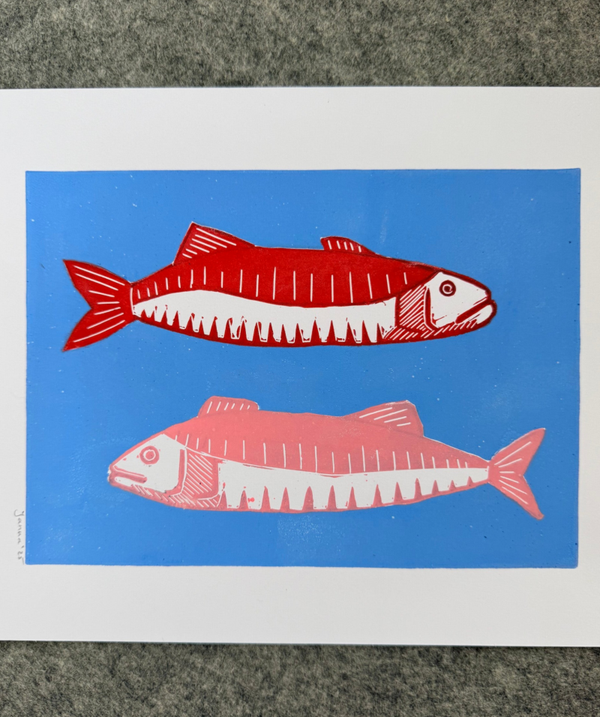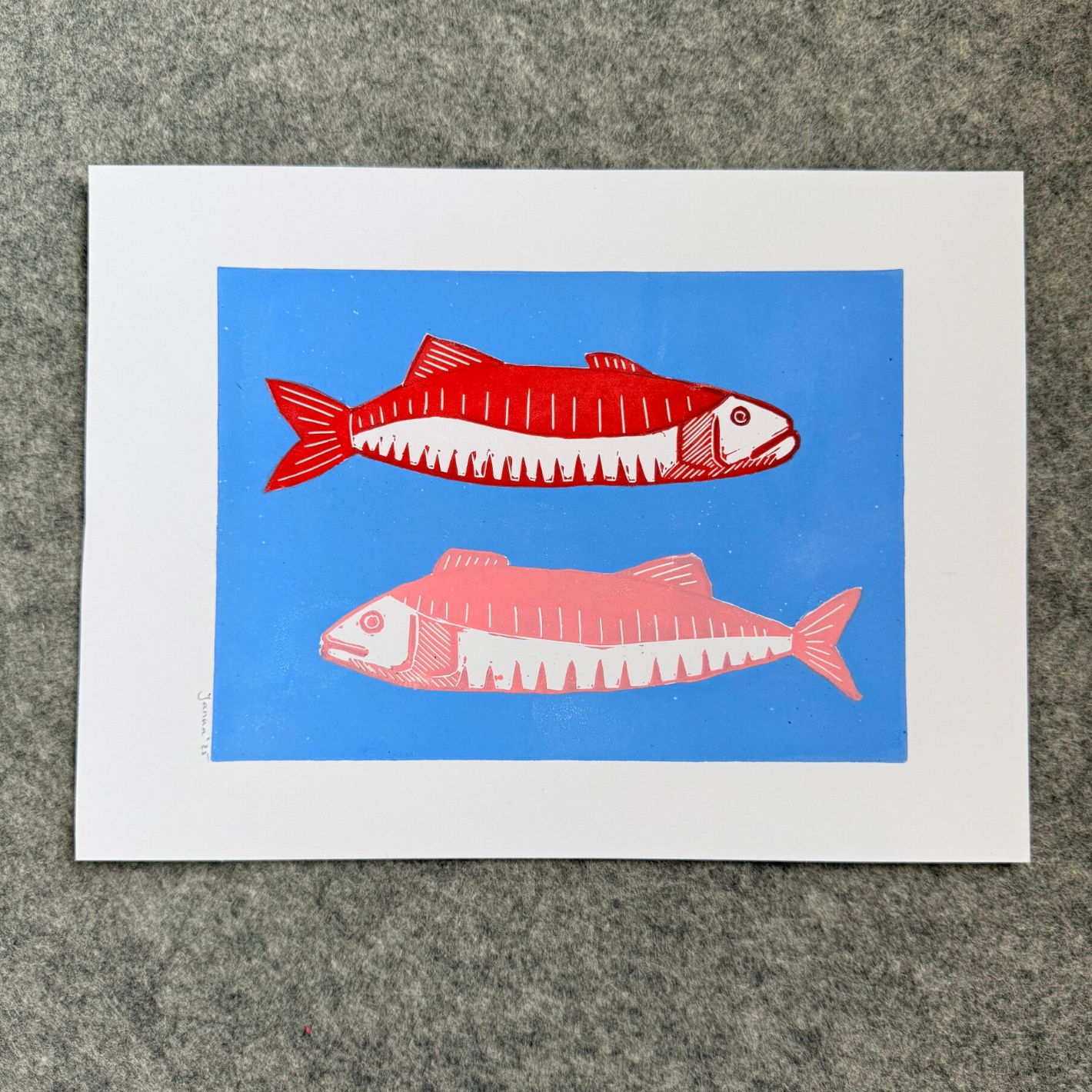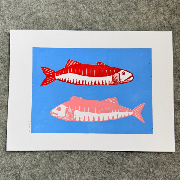 Met de handgesneden en hand afgedrukte linosnede "pop art vissen". Alle linosnedes zijn door mij met de hand gemaakt en met de hand geprint. Handgedrukte linosnedes kunnen van print tot print variëren. Bekijk de foto's goed voor de details. De linosnedes zijn afgdrukt met block printing inkt op waterbasis. Alle lino's worden of zijn met de hand gesigneerd met potlood. Prijzen kunnen varieren vanwege het papier dat gebruikt is en de kwaliteit of complexiteit van de druk van de linosnede. Afgedrukt op wit zuurvrij papier, 220 g/m2.