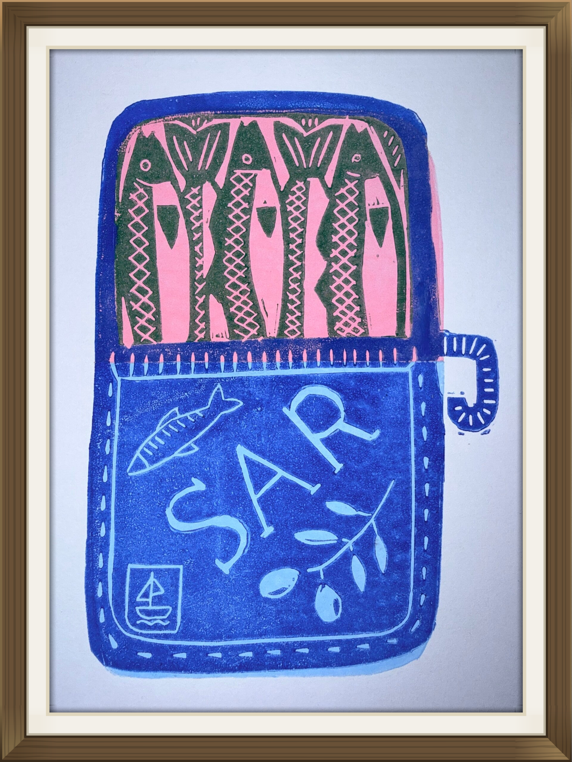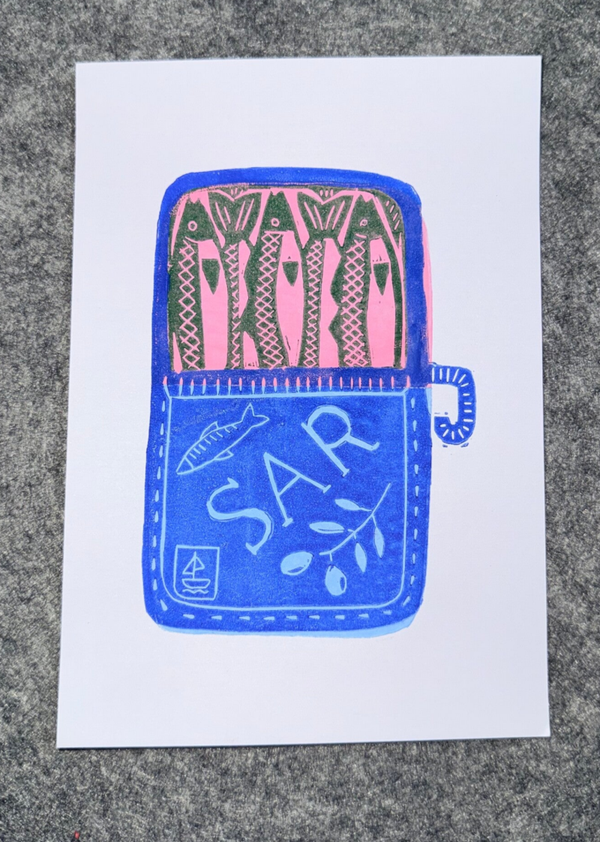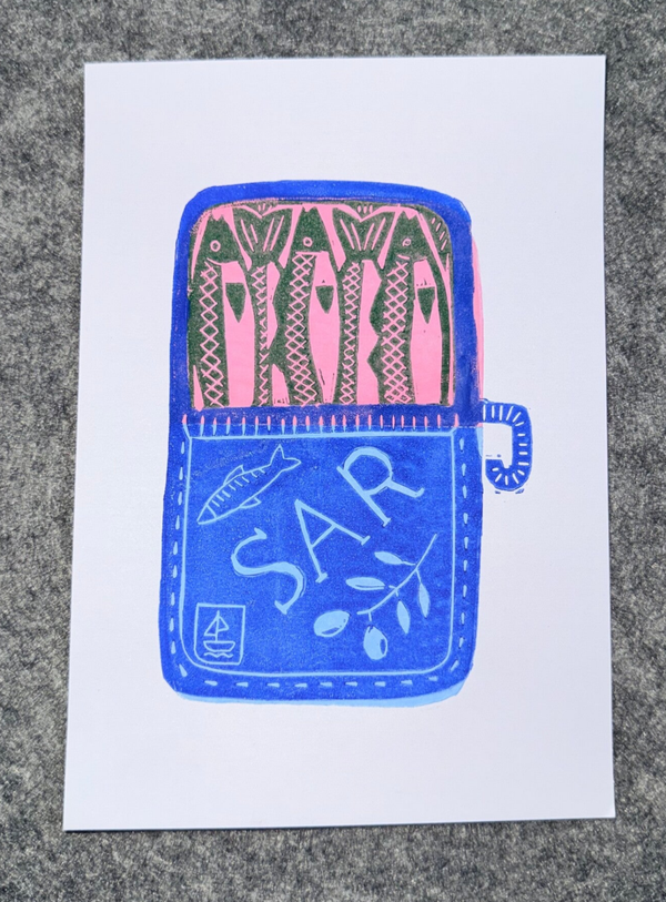 Met de handgesneden en hand afgedrukte linosnede "blik sardines". Alle linosnedes zijn door mij met de hand gemaakt en met de hand geprint. Handgedrukte linosnedes kunnen van print tot print variëren. Bekijk de foto's goed voor de details. De linosnedes zijn afgdrukt met block printing inkt op waterbasis. Alle lino's worden of zijn met de hand gesigneerd met potlood. Prijzen kunnen varieren vanwege het papier dat gebruikt is en de kwaliteit of complexiteit van de druk van de linosnede. Afgedrukt op wit zuurvrij papier, 110 g/m2.