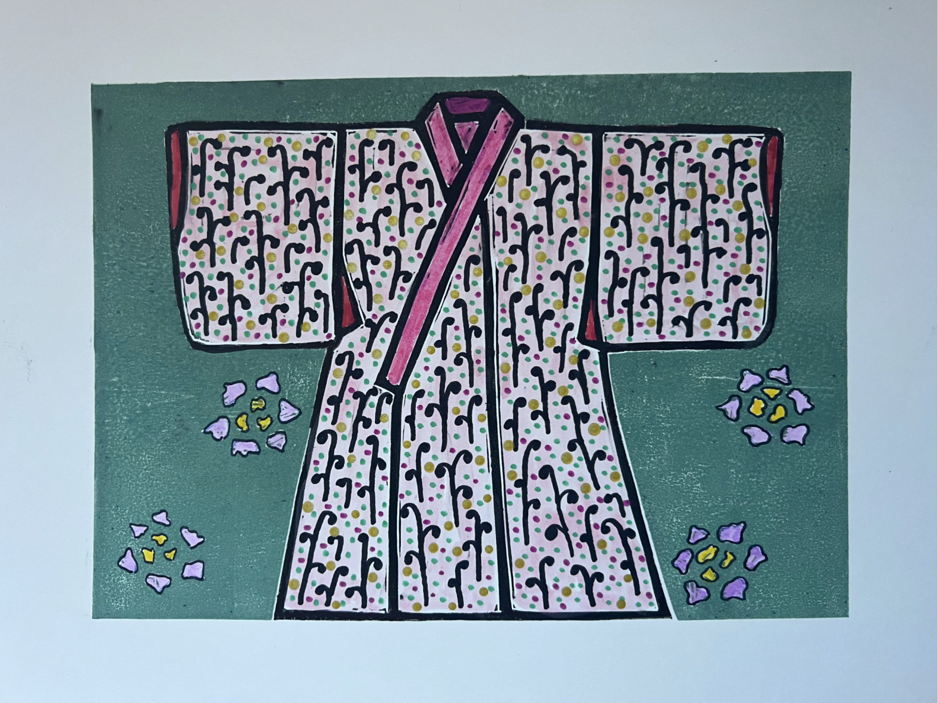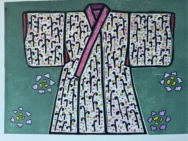 Dit werk is een cobinatie van een linoprint en met de handaangebrachte details. De linoprint is afgedrukt met twee onderdelen (de kimono en de achtergrond). Daarna heb ik bij de kimono met de hand details aangebracht. Alle linosnedes zijn door mij met de hand gemaakt en met de hand geprint. Handgedrukte linosnedes kunnen van print tot print variëren. Bekijk de foto's goed voor de details. De linosnedes zijn afgedrukt met block printing inkt op waterbasis. Alle lino's worden of zijn met de hand gesigneerd met potlood. Prijzen kunnen variëren het papier dat gebruikt is en de kwaliteit of complexiteit van de druk van de linosnede of het werk.