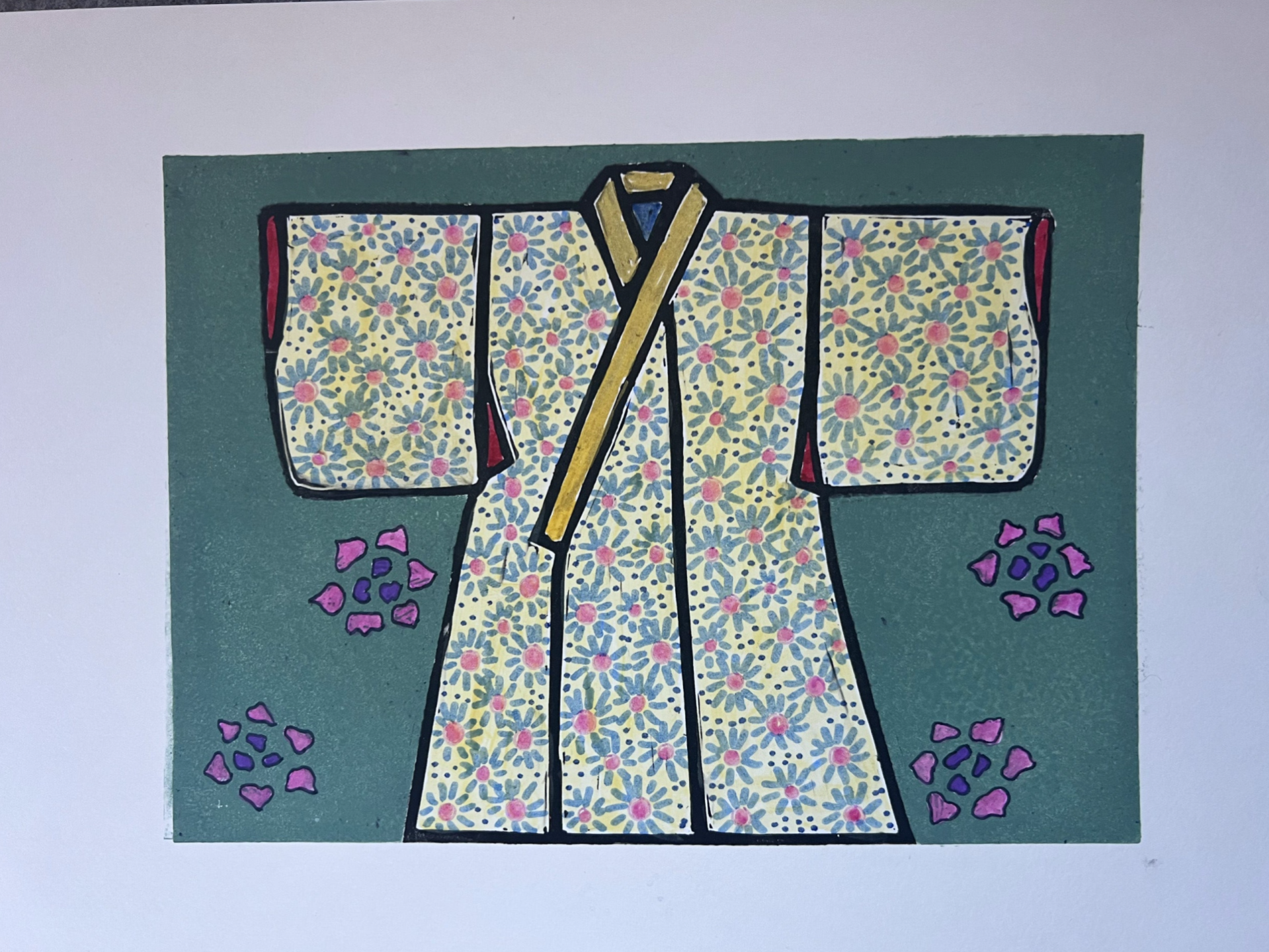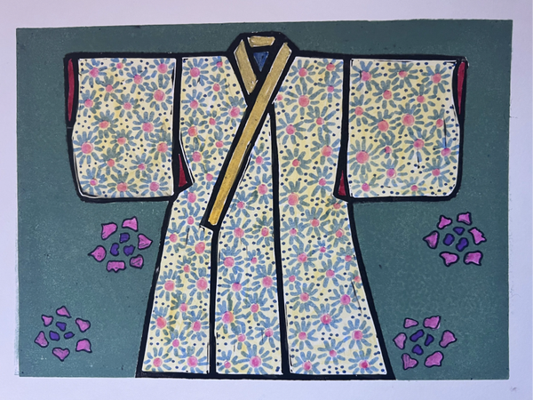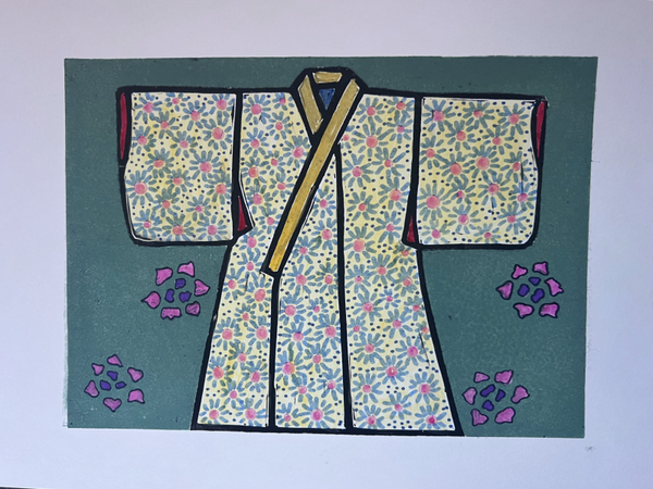 Dit werk is een combinatie van een linoprint en met de handaangebrachte details. De linoprint is afgedrukt met twee onderdelen (de kimono en de achtergrond). Daarna heb ik bij de kimono met de hand details aangebracht. Alle linosnedes zijn door mij met de hand gemaakt en met de hand geprint. Handgedrukte linosnedes kunnen van print tot print variëren. Bekijk de foto's goed voor de details. De linosnedes zijn afgedrukt met block printing inkt op waterbasis. Alle lino's worden of zijn met de hand gesigneerd met potlood. Prijzen kunnen variëren het papier dat gebruikt is en de kwaliteit of complexiteit van de druk van de linosnede of het werk.