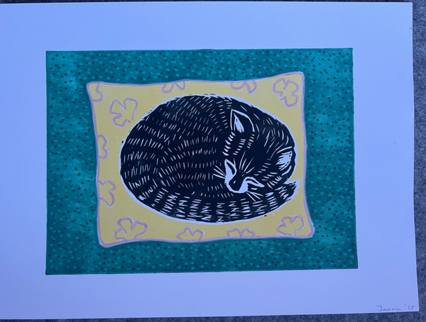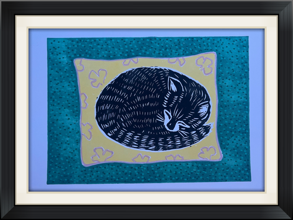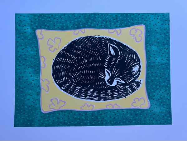 Linoprint slapende kat op kussen