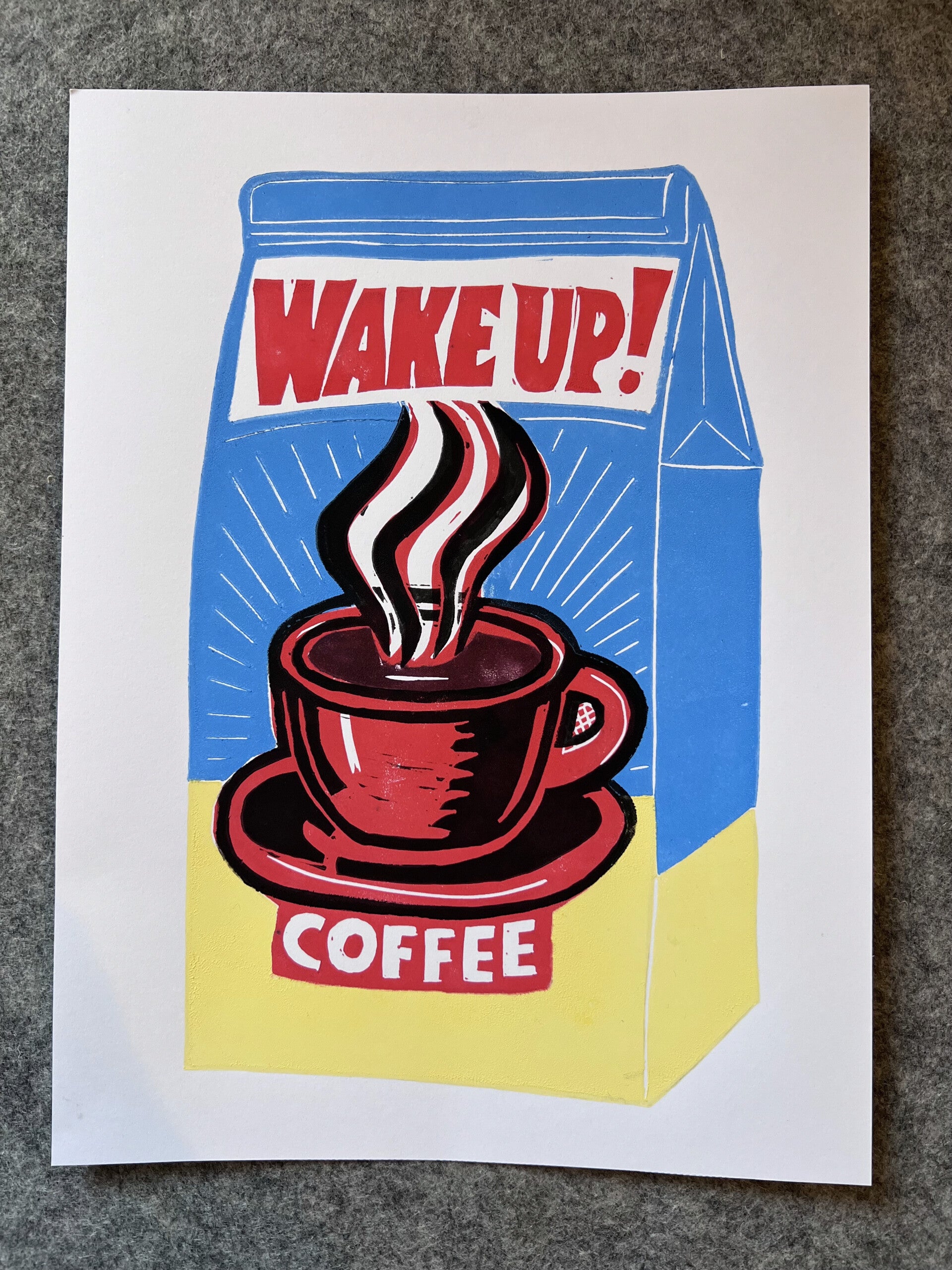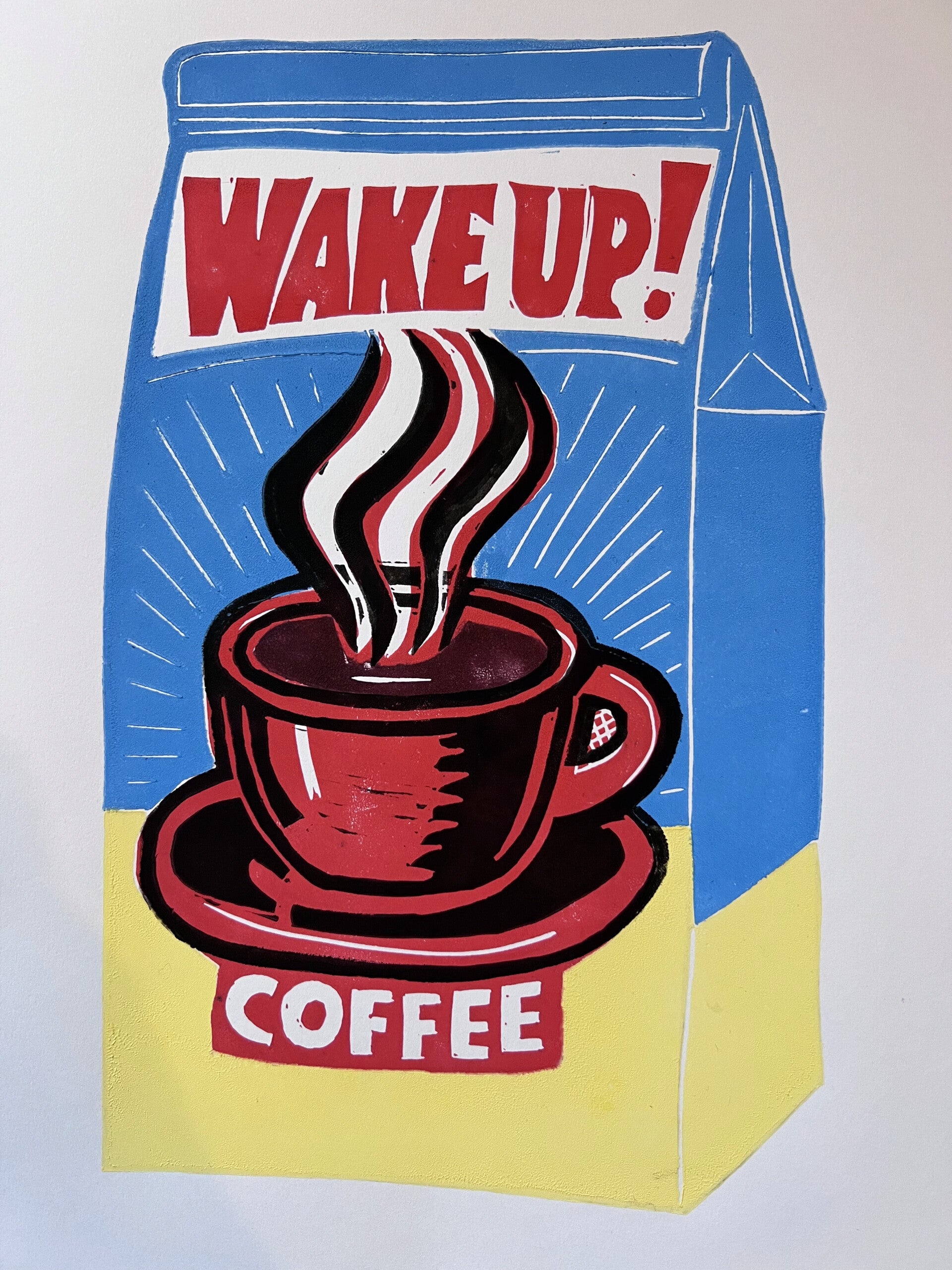 linoprint koffiepak Wake up!