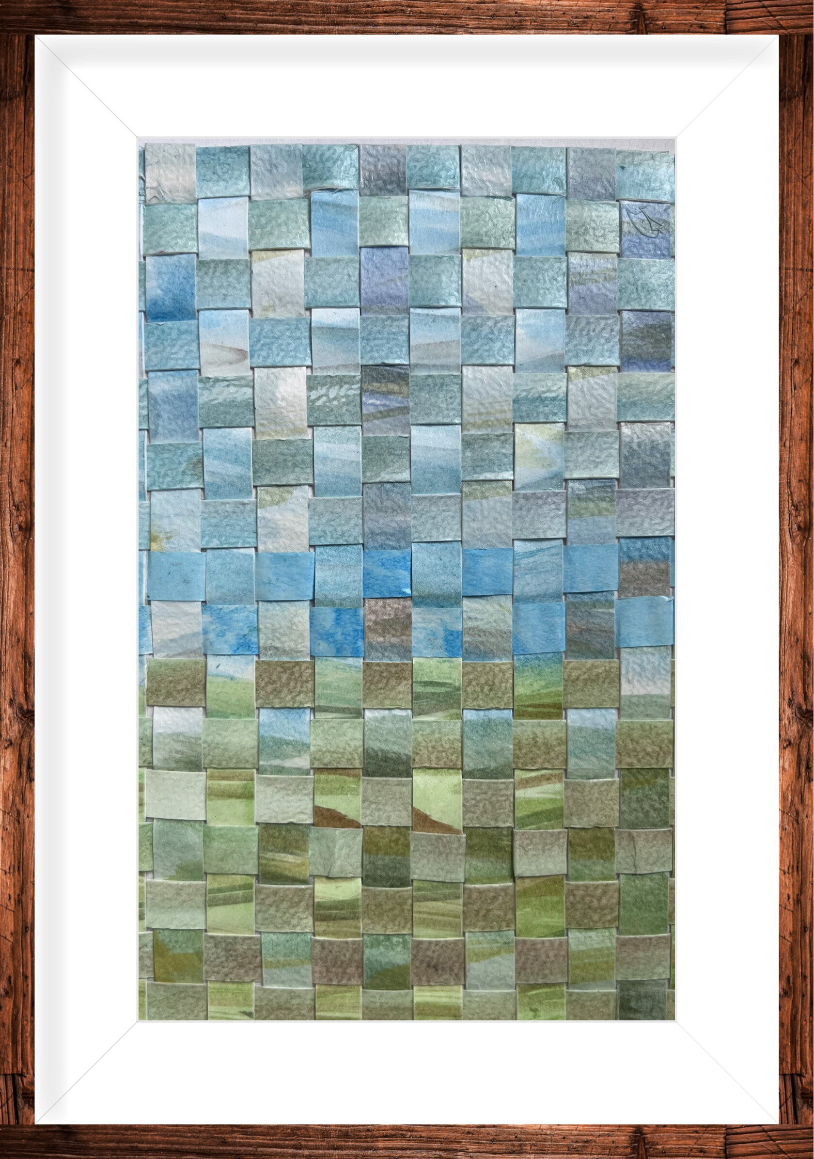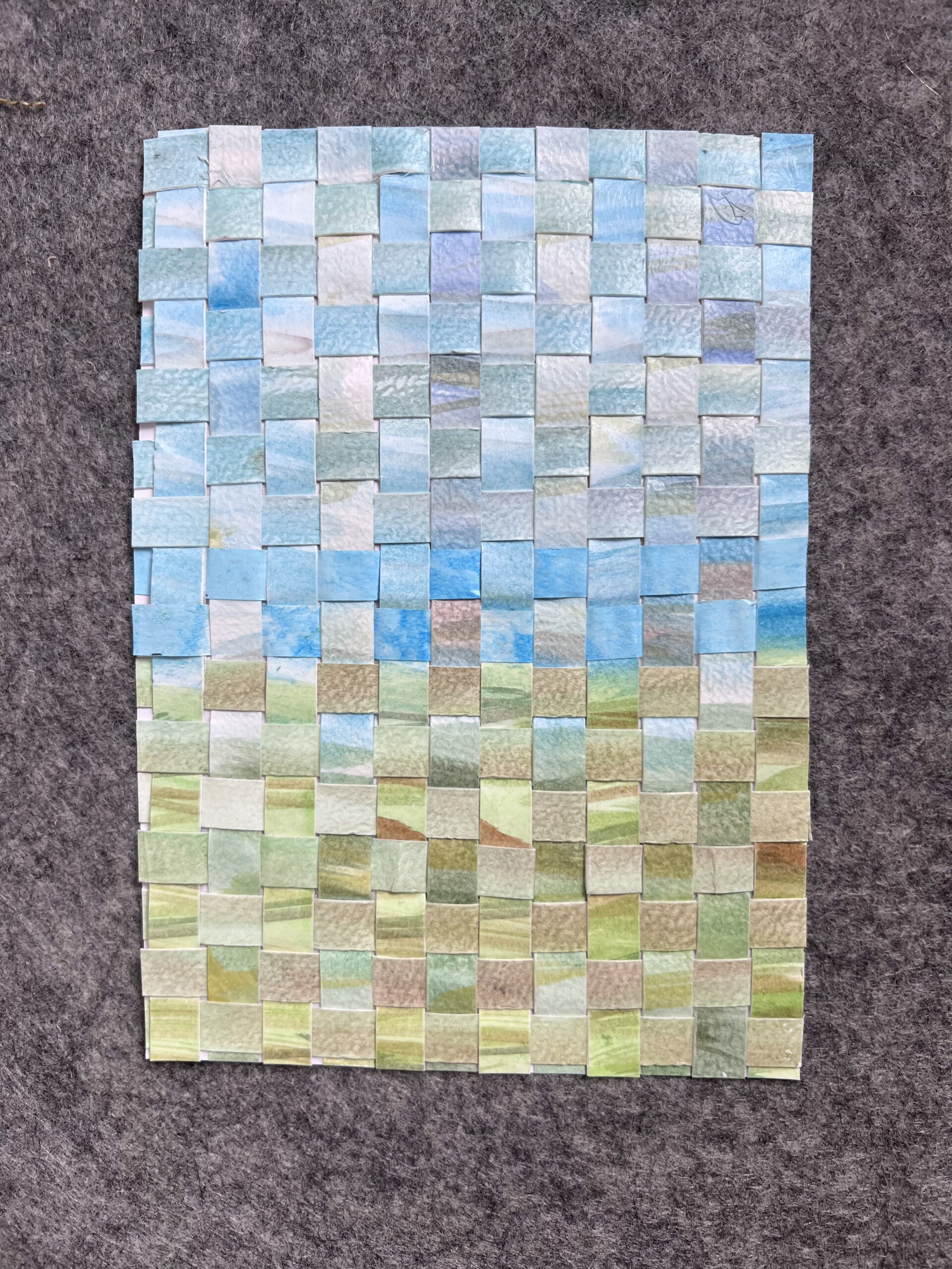 Met de hand gewoven stoken om tot een abstract landschap te komen. Handgemaakte "pixels". Bekijk de foto's goed voor de details en het handgemaakte karakter.