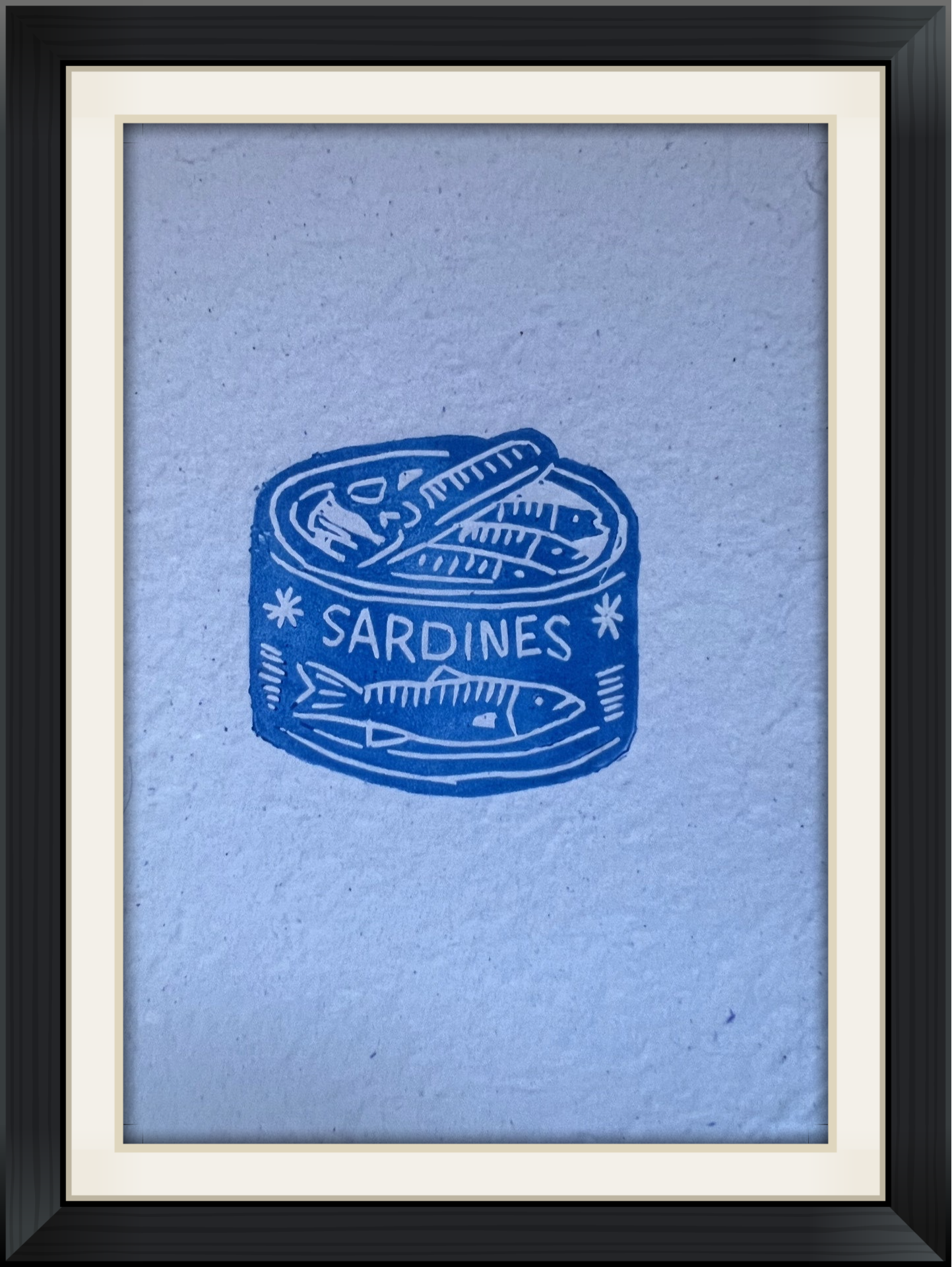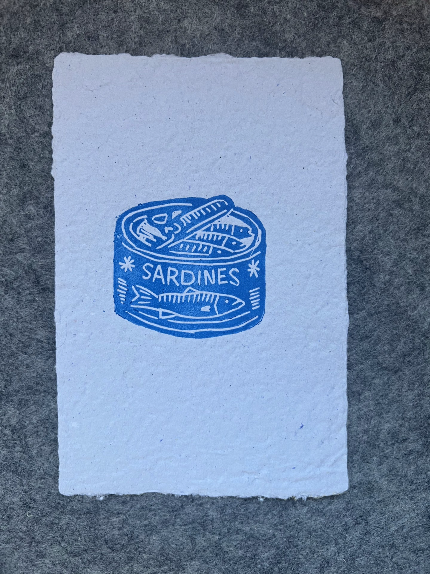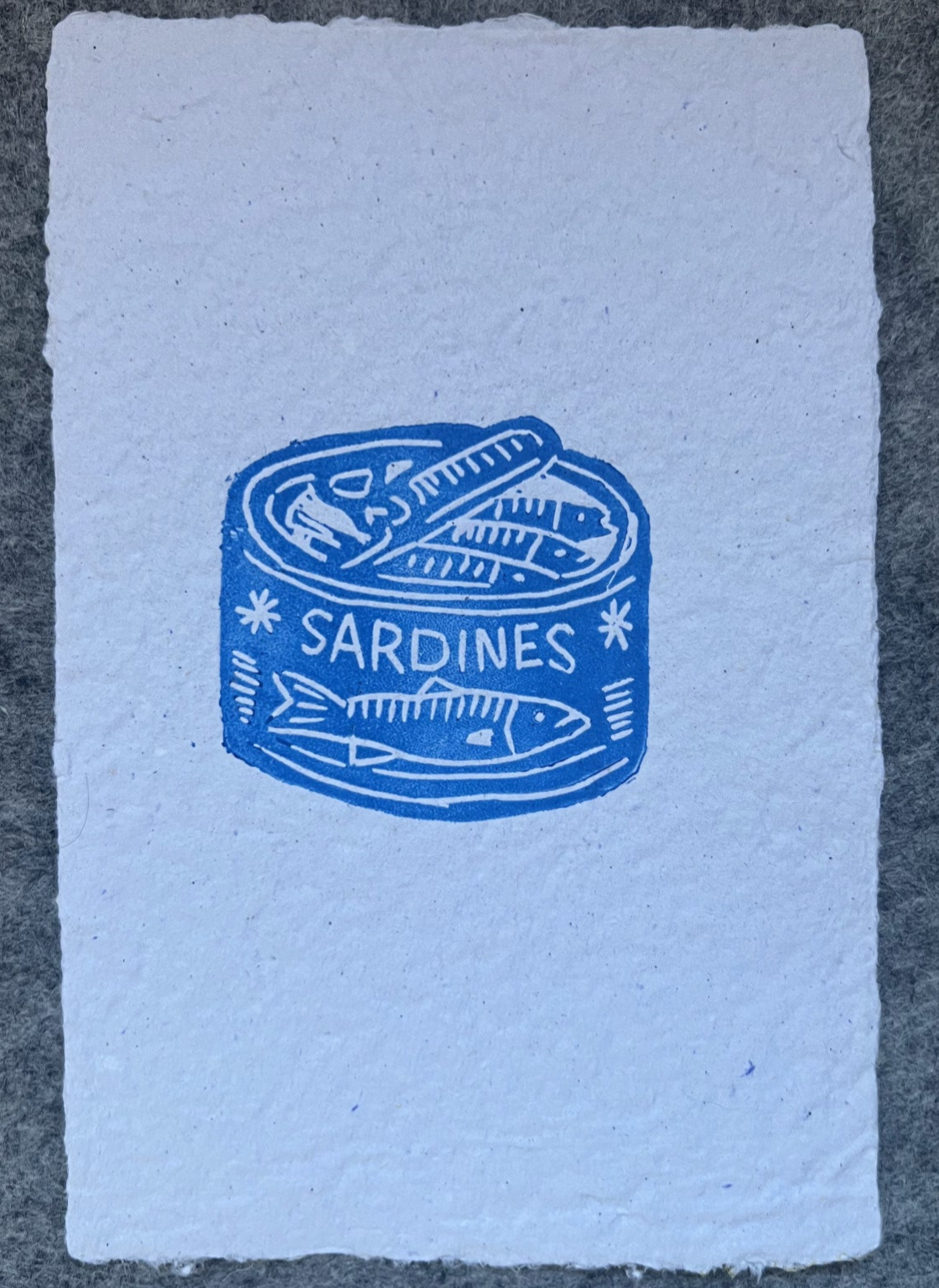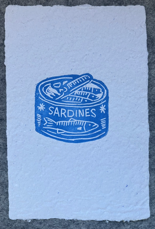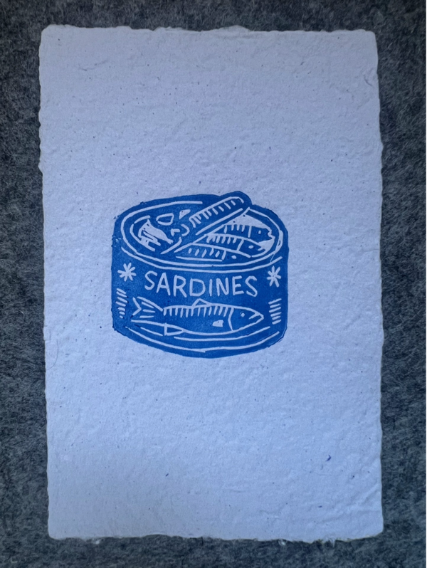 kleine linoprint blik sardines op handgeschept papier