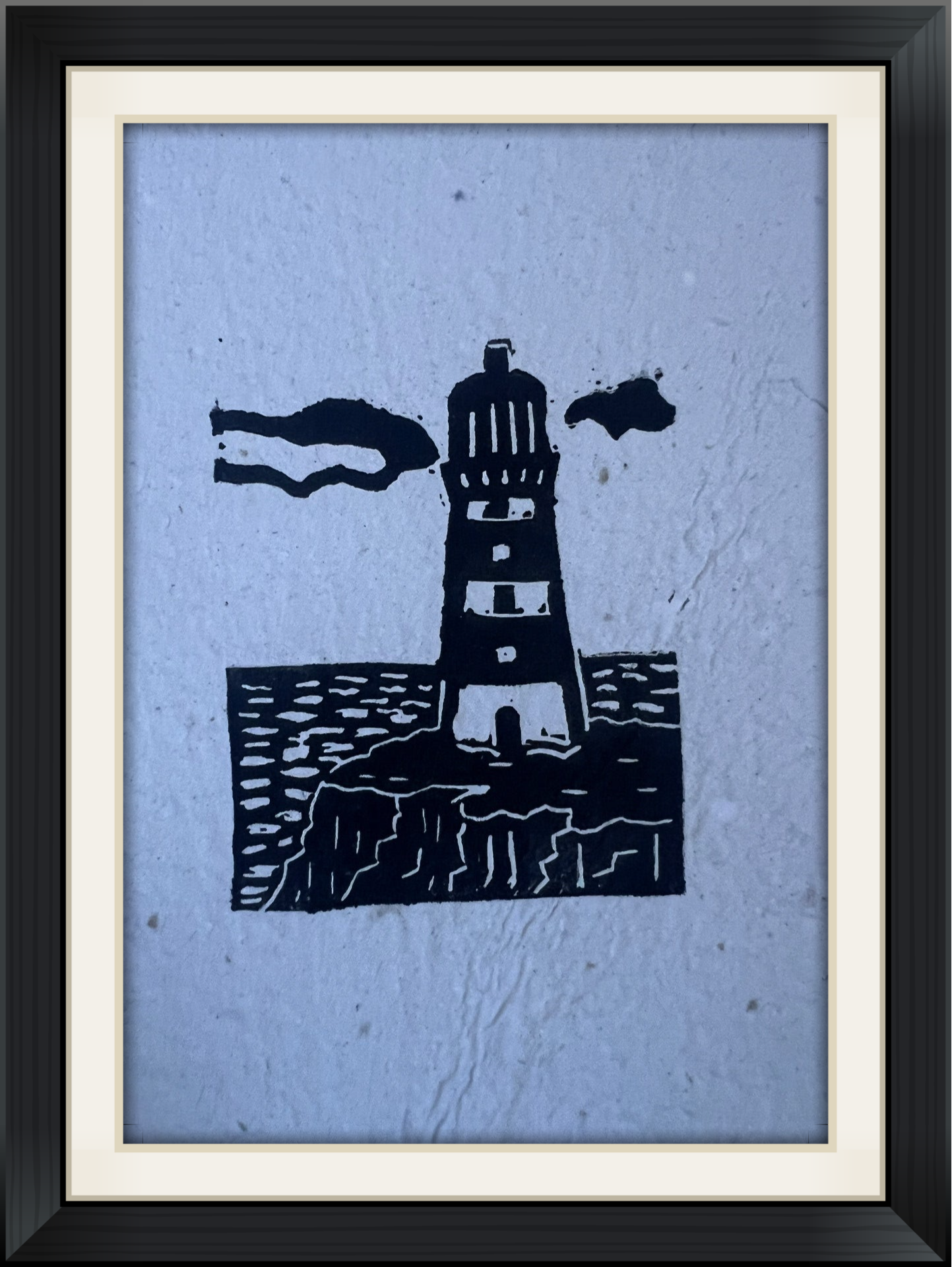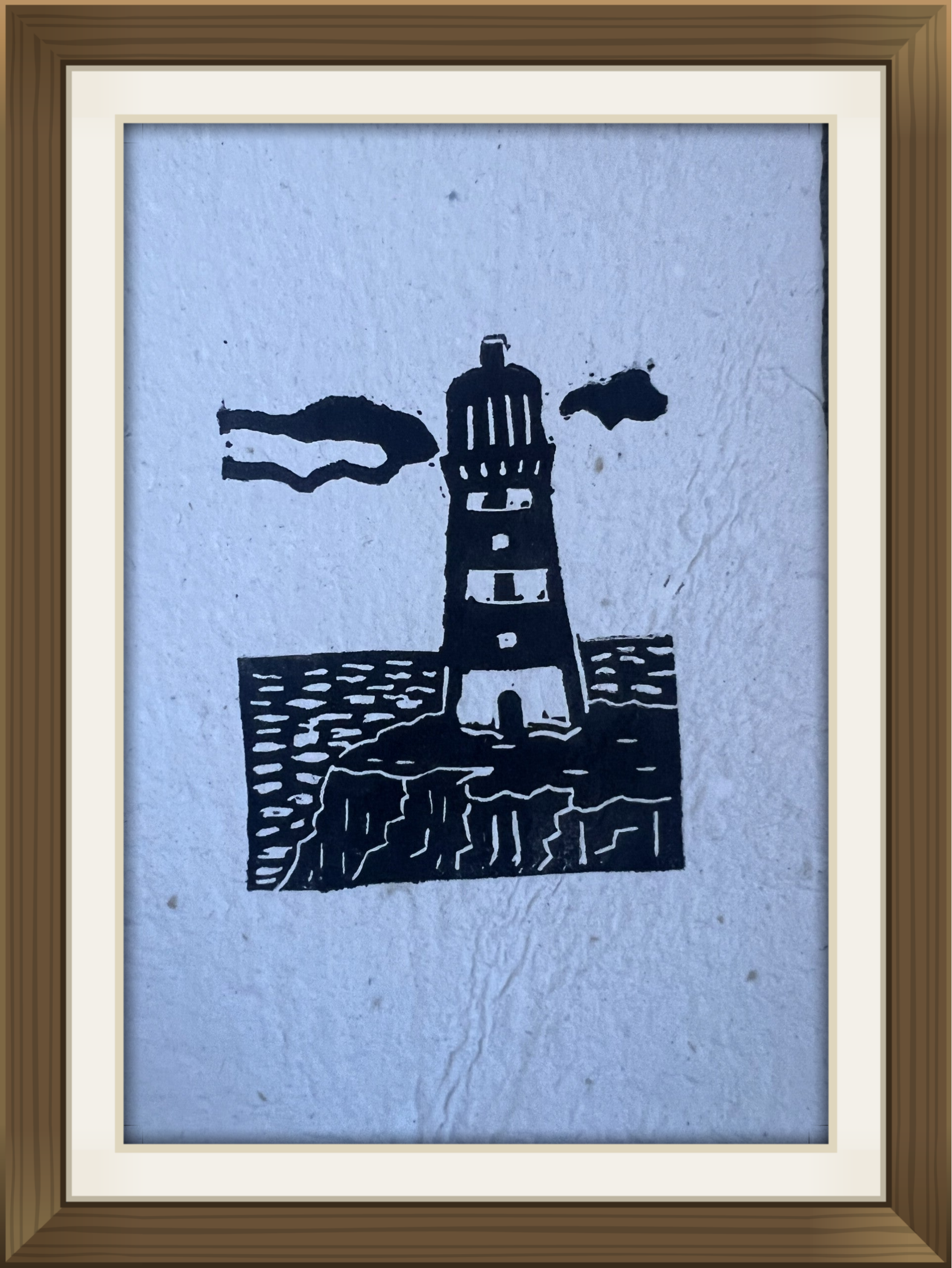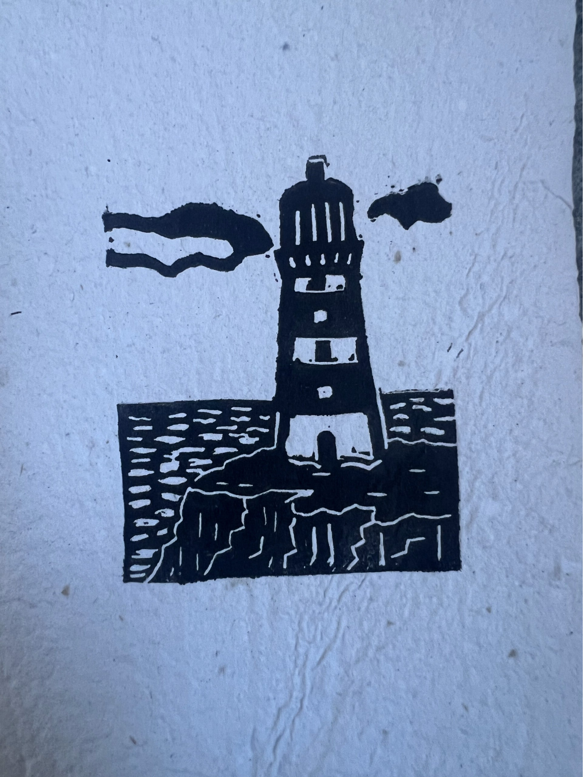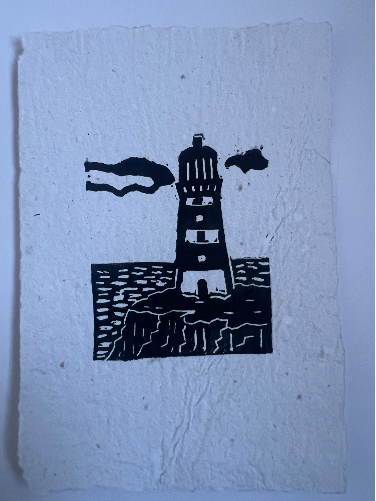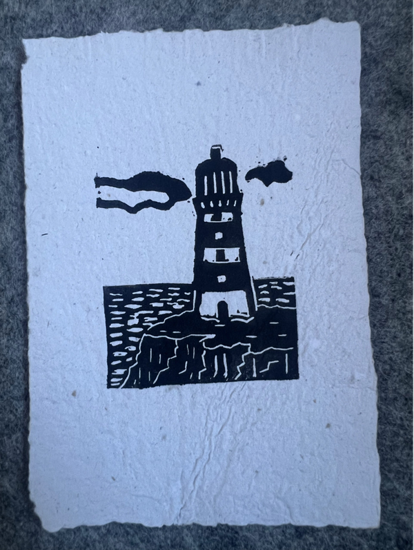 kleine linoprint "vuurtoren" op handgeschept papier.