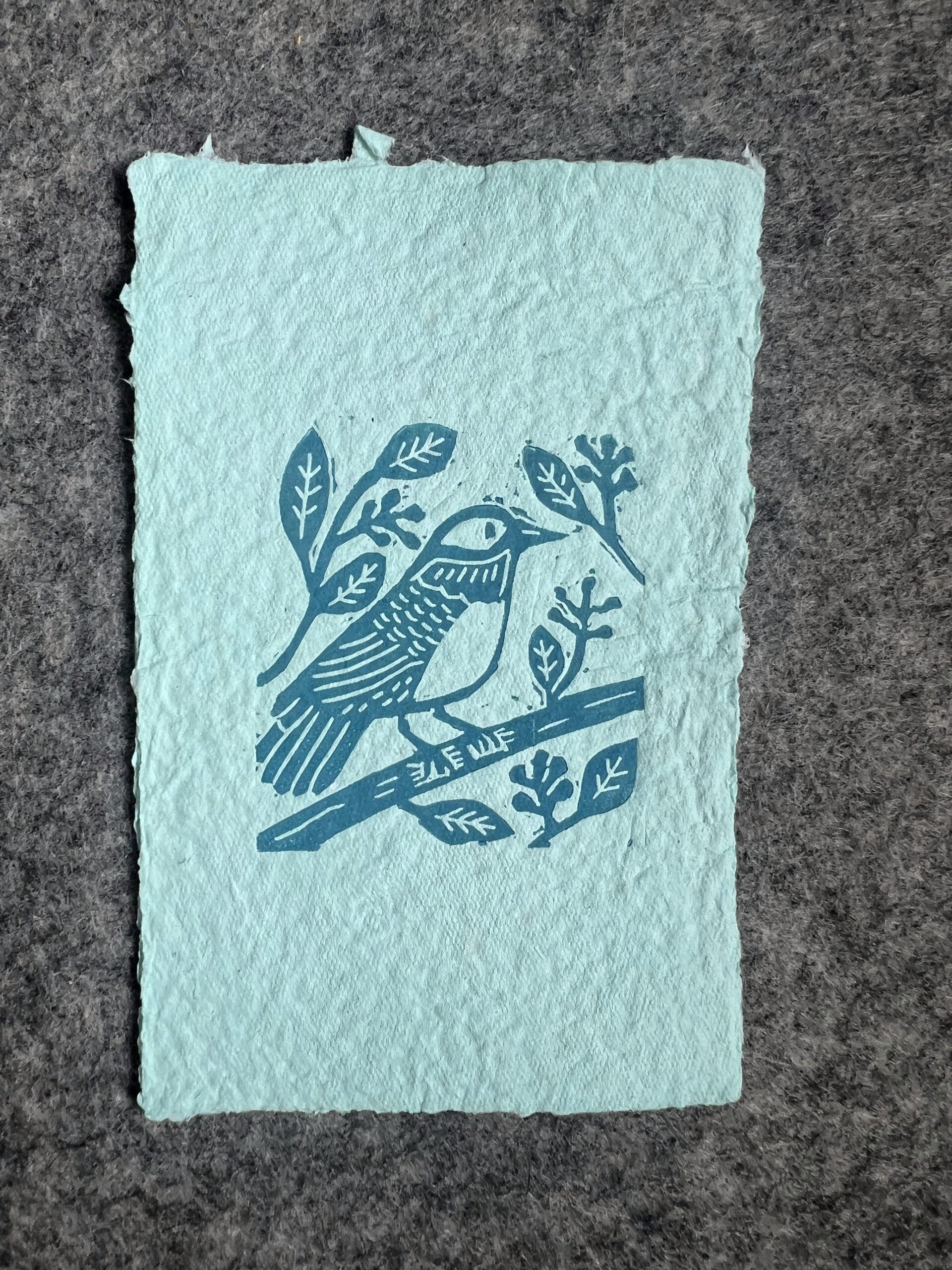 kleine linoprint vogeltje op tak