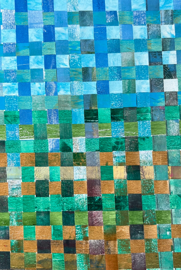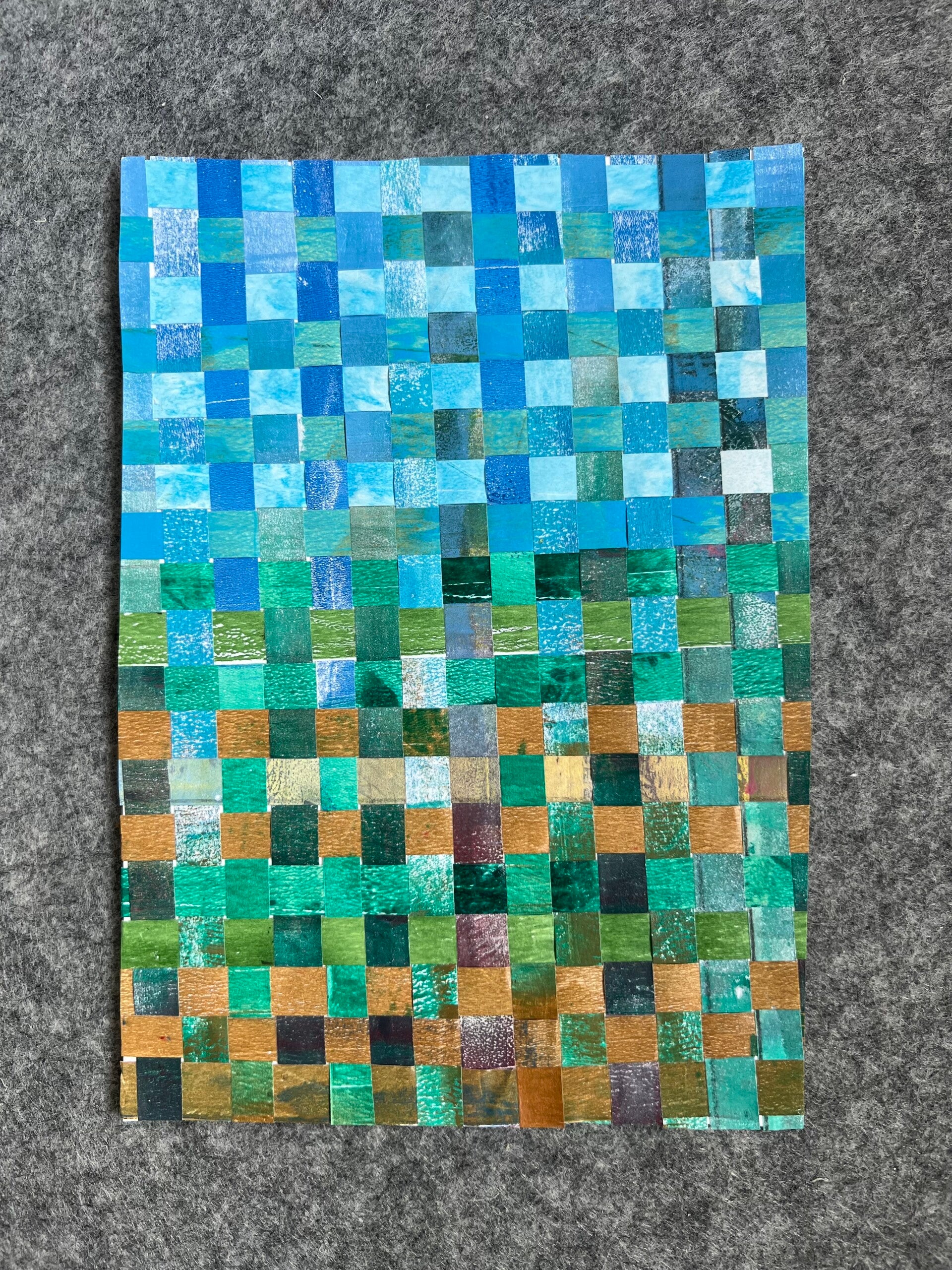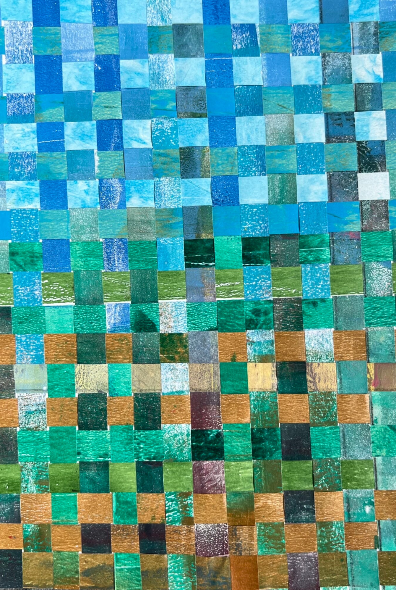 Met de hand gewoven stoken van monoprint om tot een abstract landschap te komen. Handgemaakte "pixels". Bekijk de foto's goed voor de details en het handgemaakte karakter.