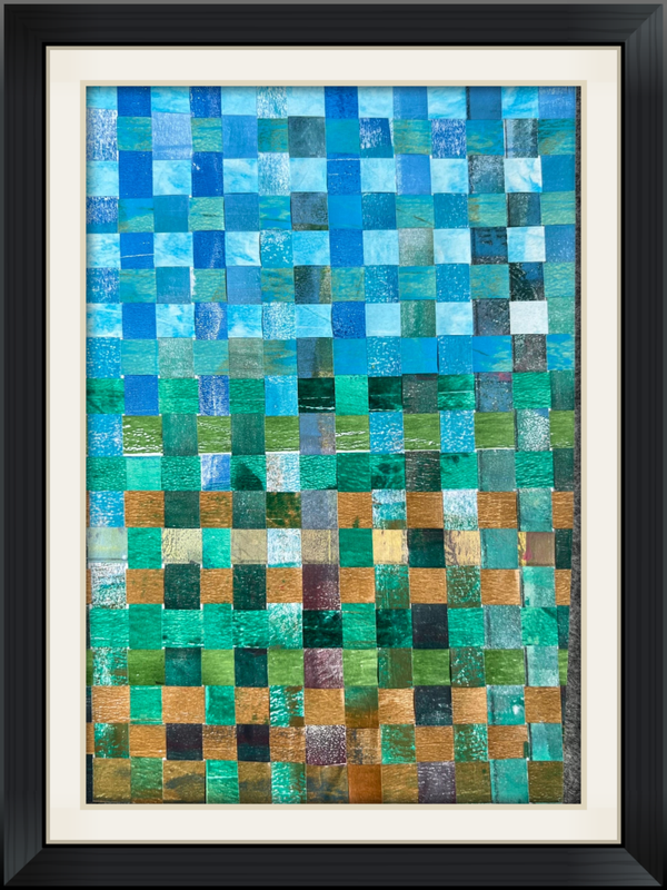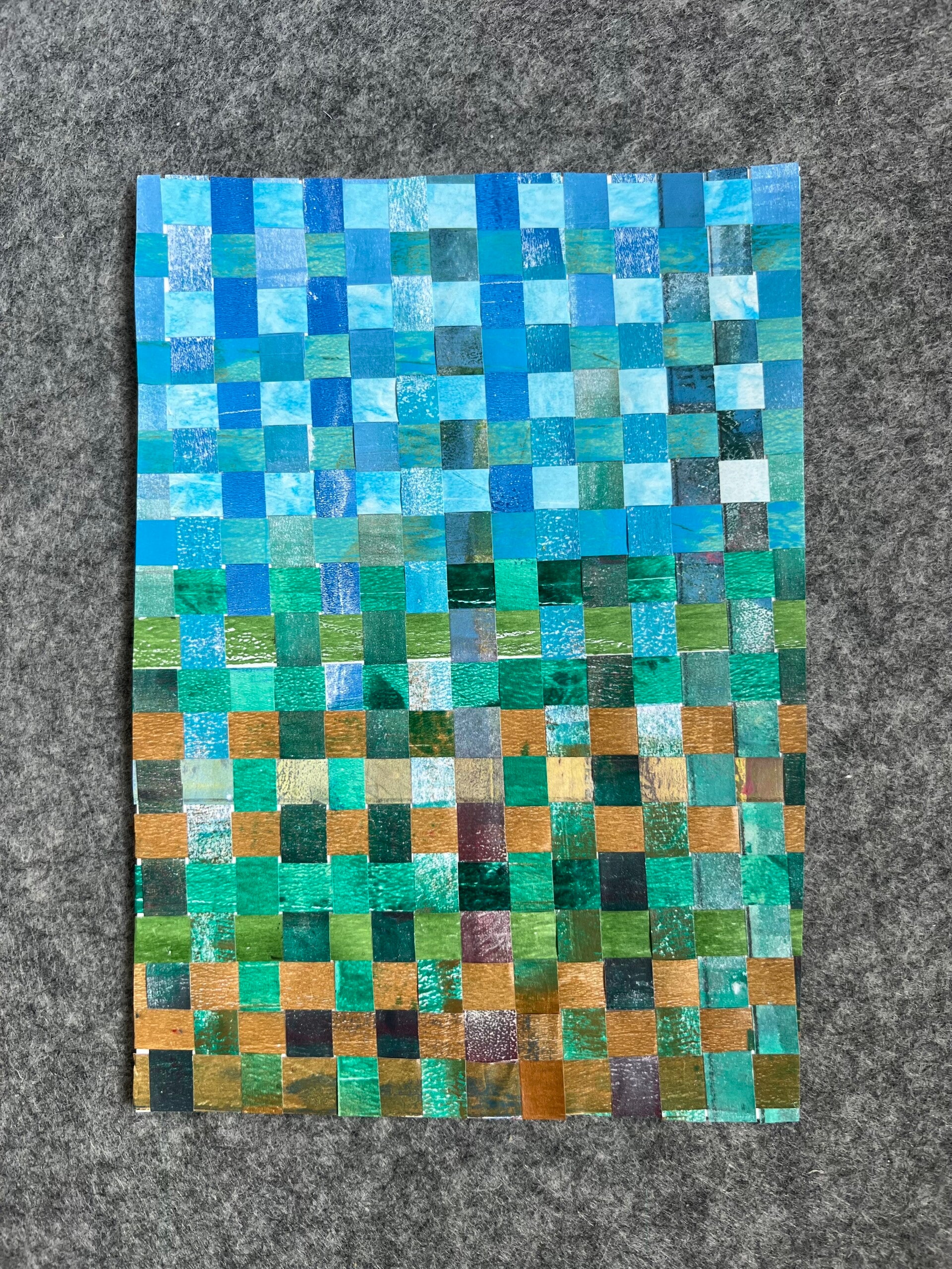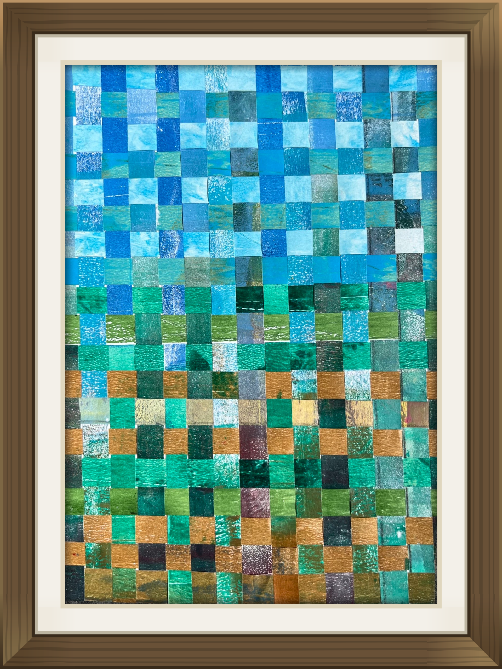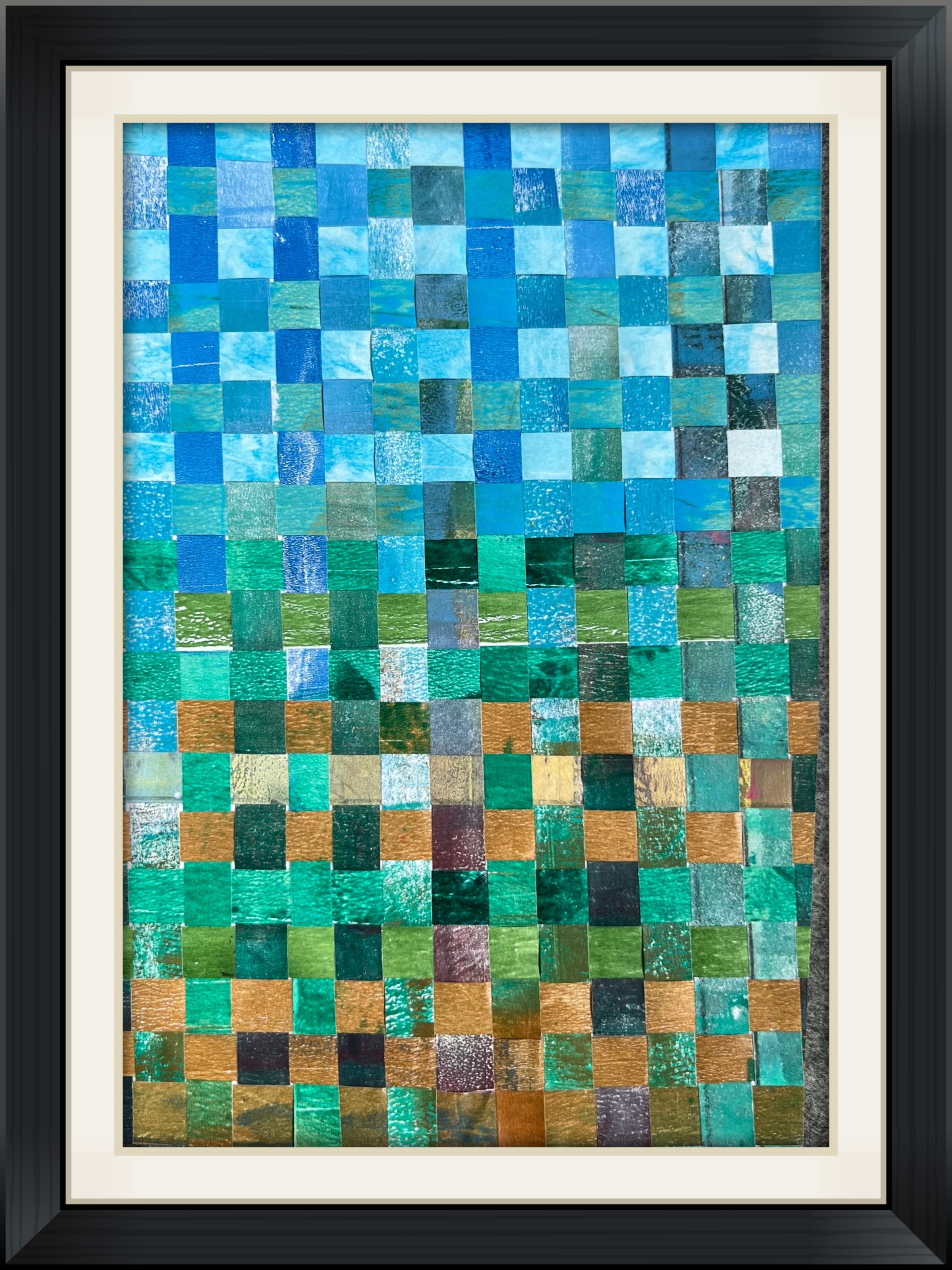Met de hand gewoven stoken van monoprint om tot een abstract landschap te komen. Handgemaakte "pixels". Bekijk de foto's goed voor de details en het handgemaakte karakter.