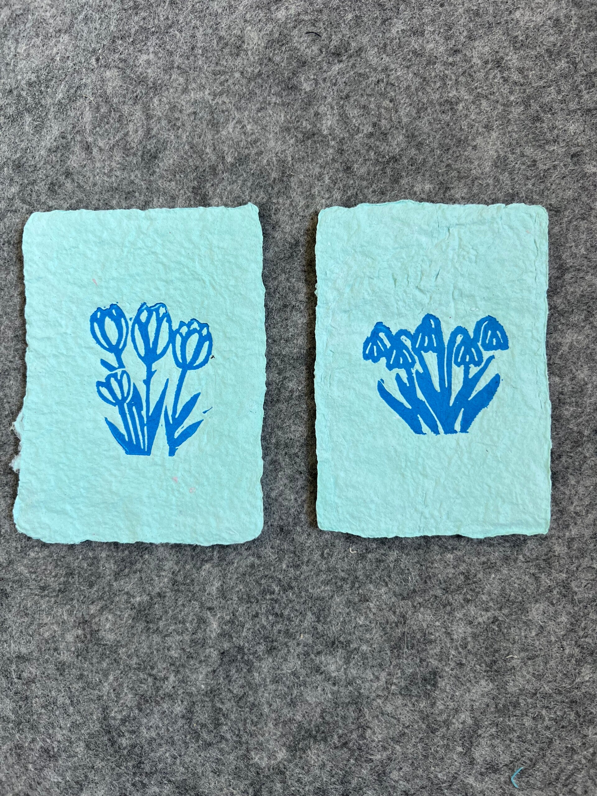 Set van twee kleine linoprints sneeuwklokje en krokus