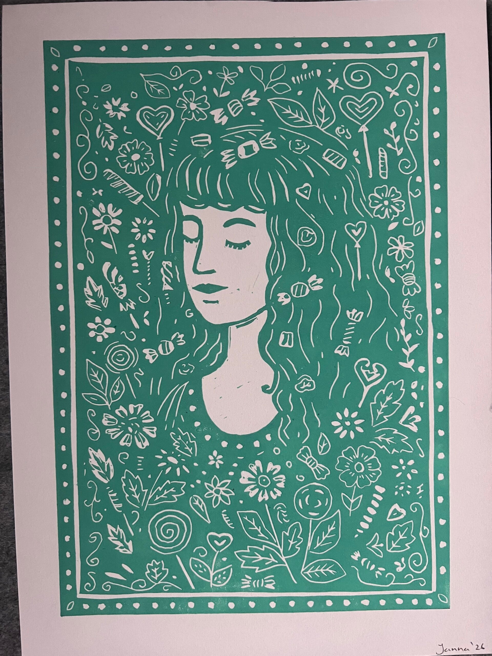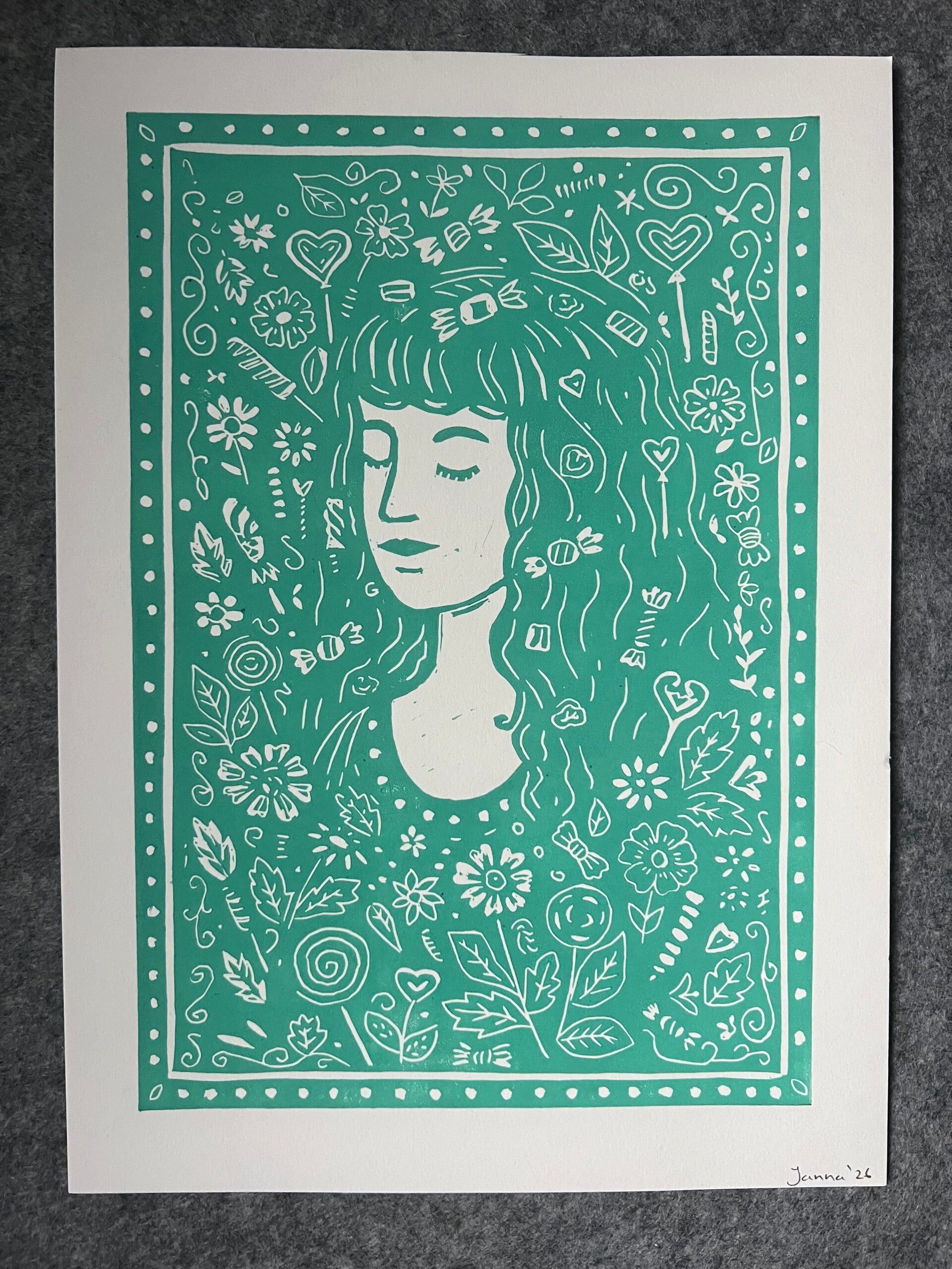 Met de handgesneden en hand afgedrukte linosnede "Candygirl". Let op komt zonder lijst en/of passe partout. Alle linosnedes zijn door mij met de hand gemaakt en met de hand geprint. Handgedrukte linosnedes kunnen van print tot print variëren. Bekijk de foto's goed voor de details. De linosnedes zijn afgdrukt met block printing inkt op waterbasis. Alle lino's worden of zijn met de hand gesigneerd met potlood. Prijzen kunnen varieren vanwege het papier dat gebruikt is en de kwaliteit of complexiteit van de druk van de linosnede.