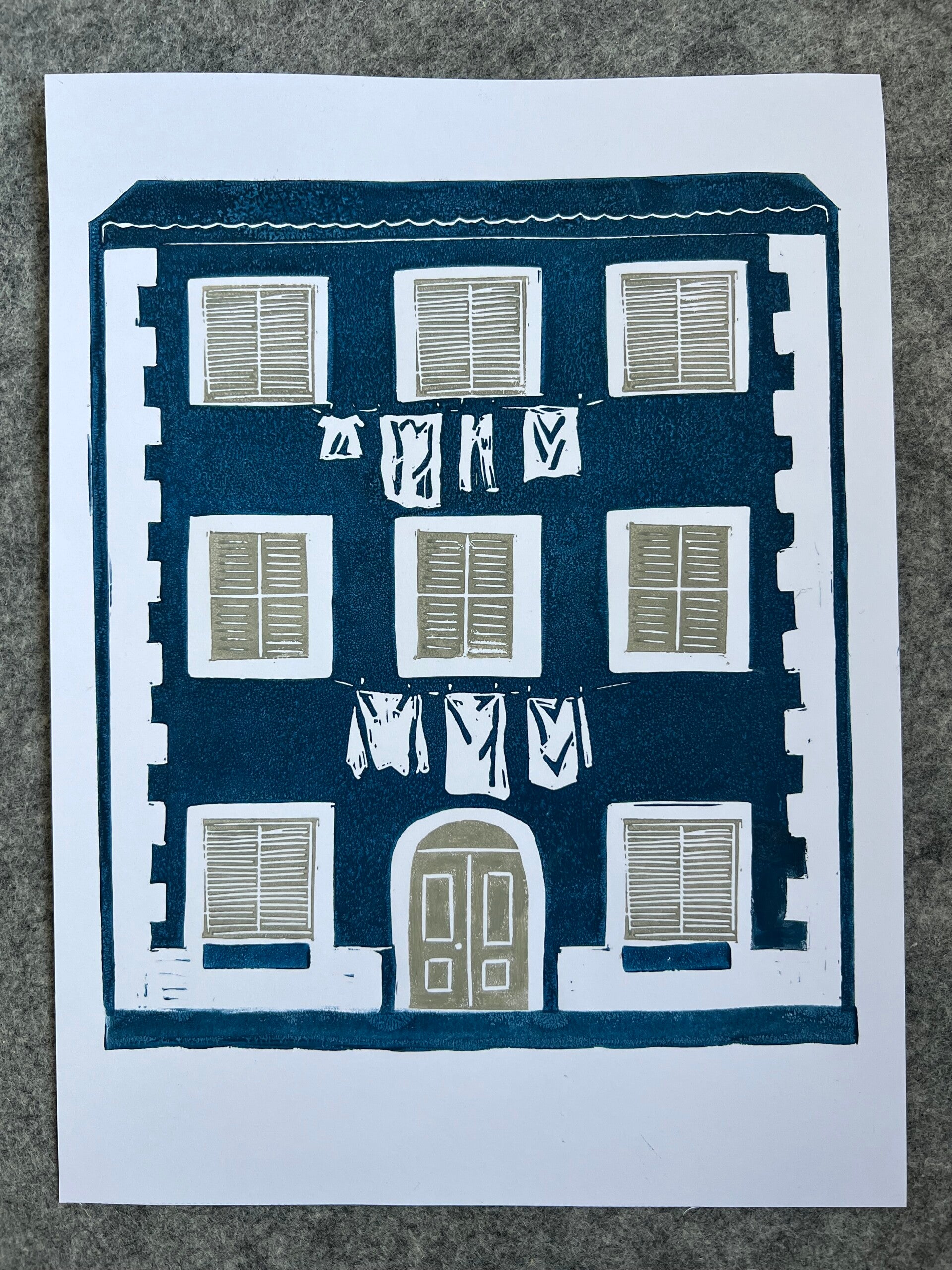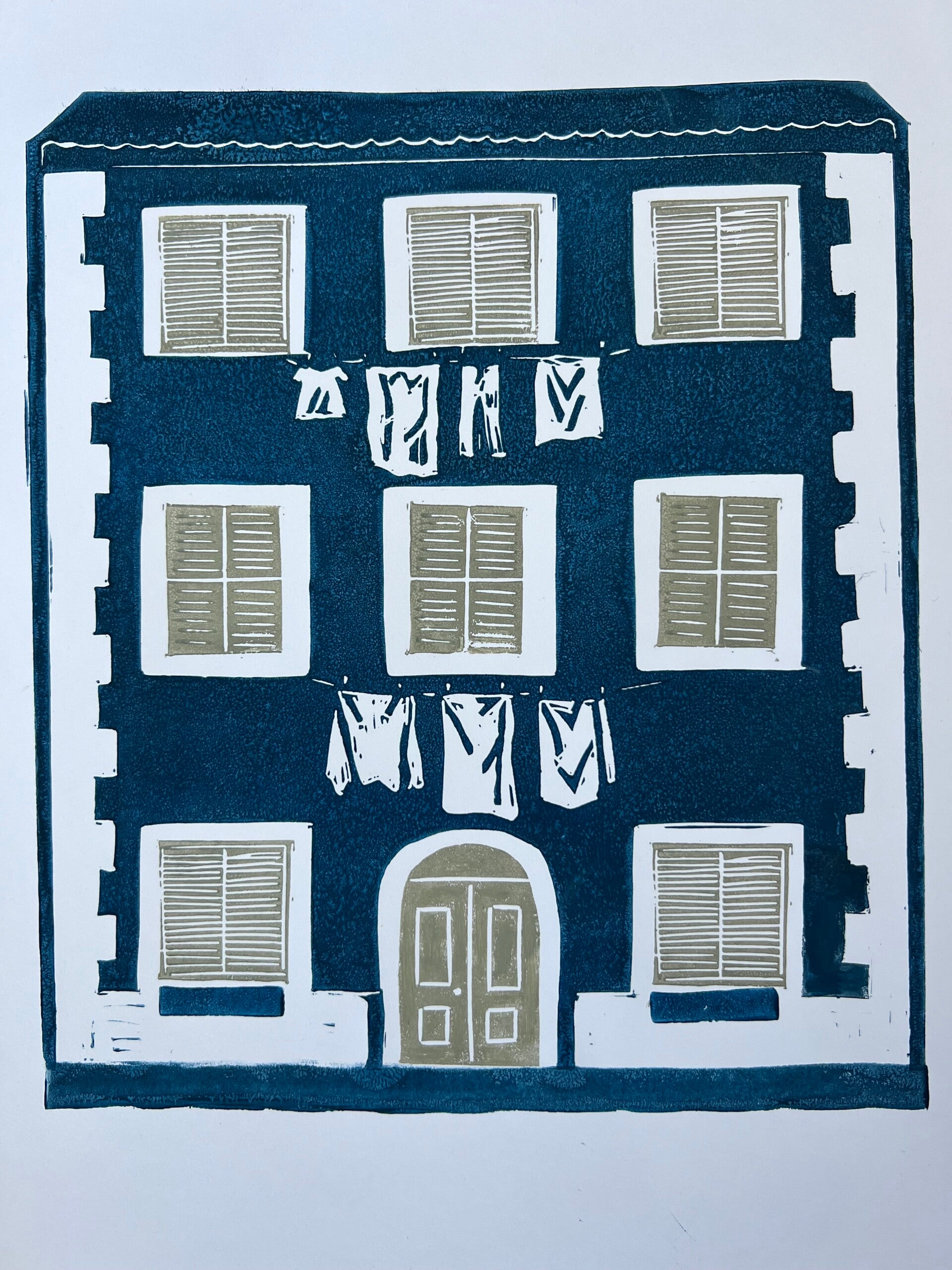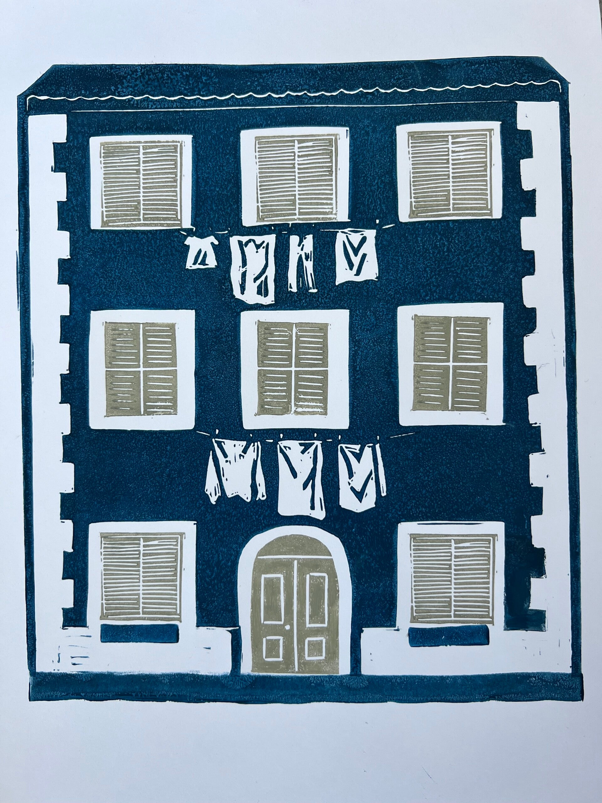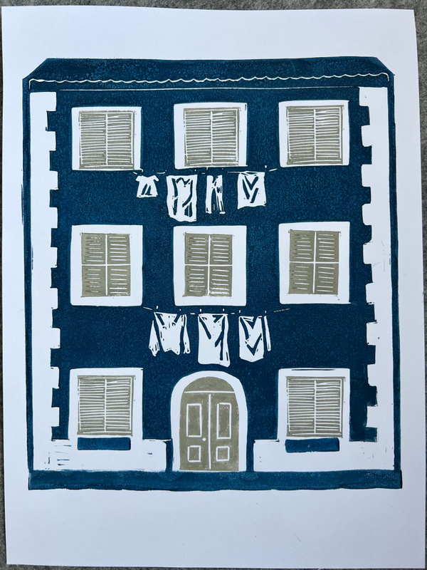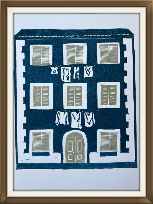 Linoprint Italiaans huis met wasgoed